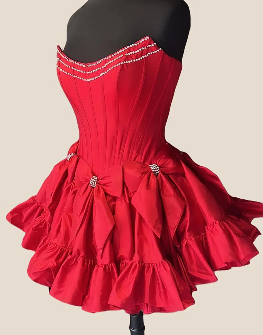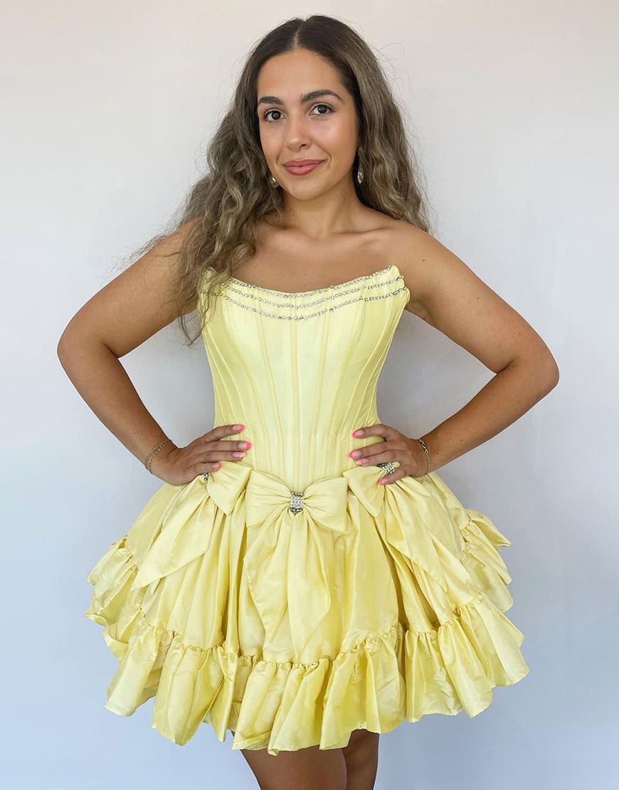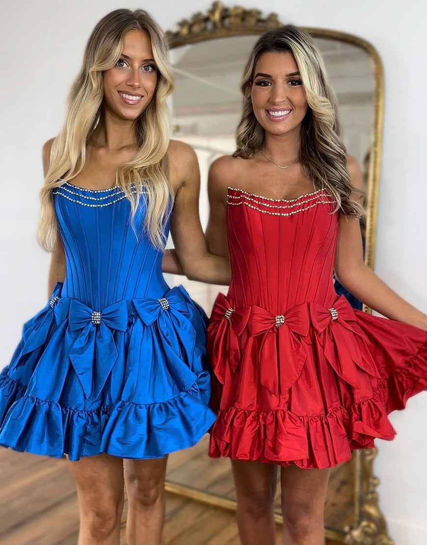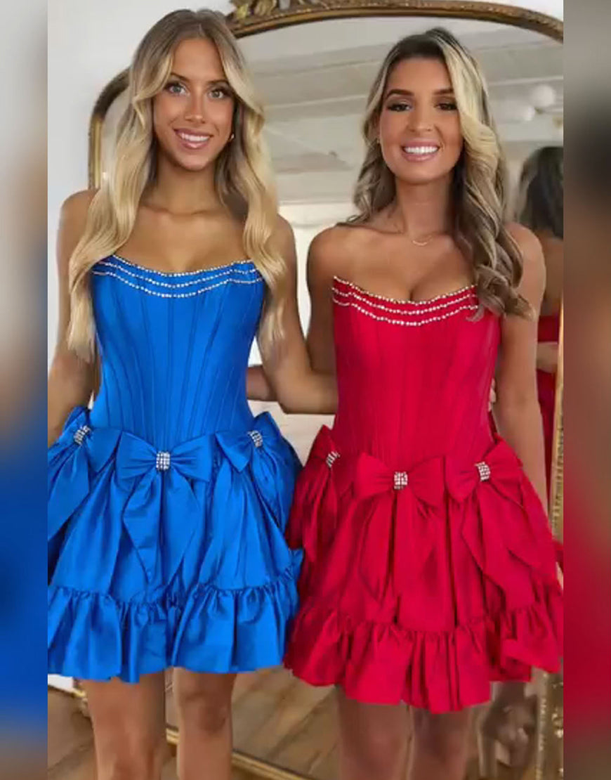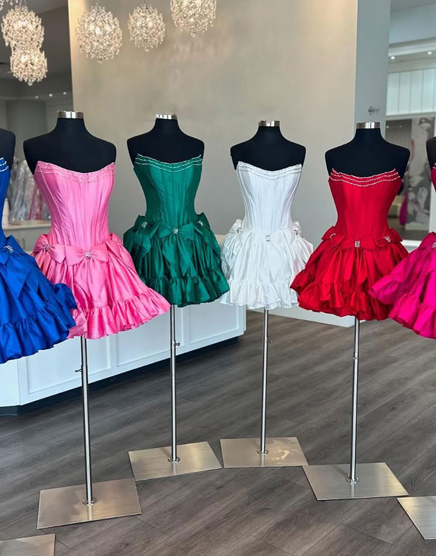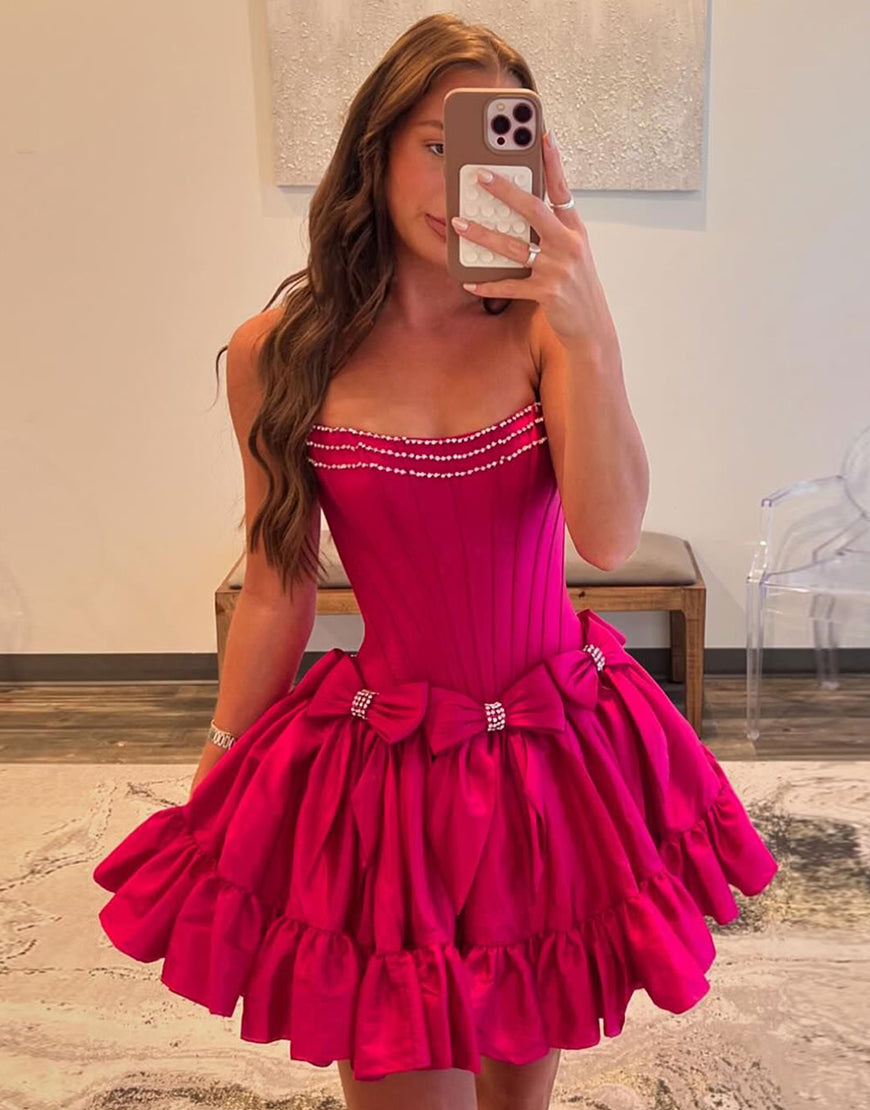 Sparkly Pink A Line Strapless Ruffled Corset Homecoming Dresses with Bow
