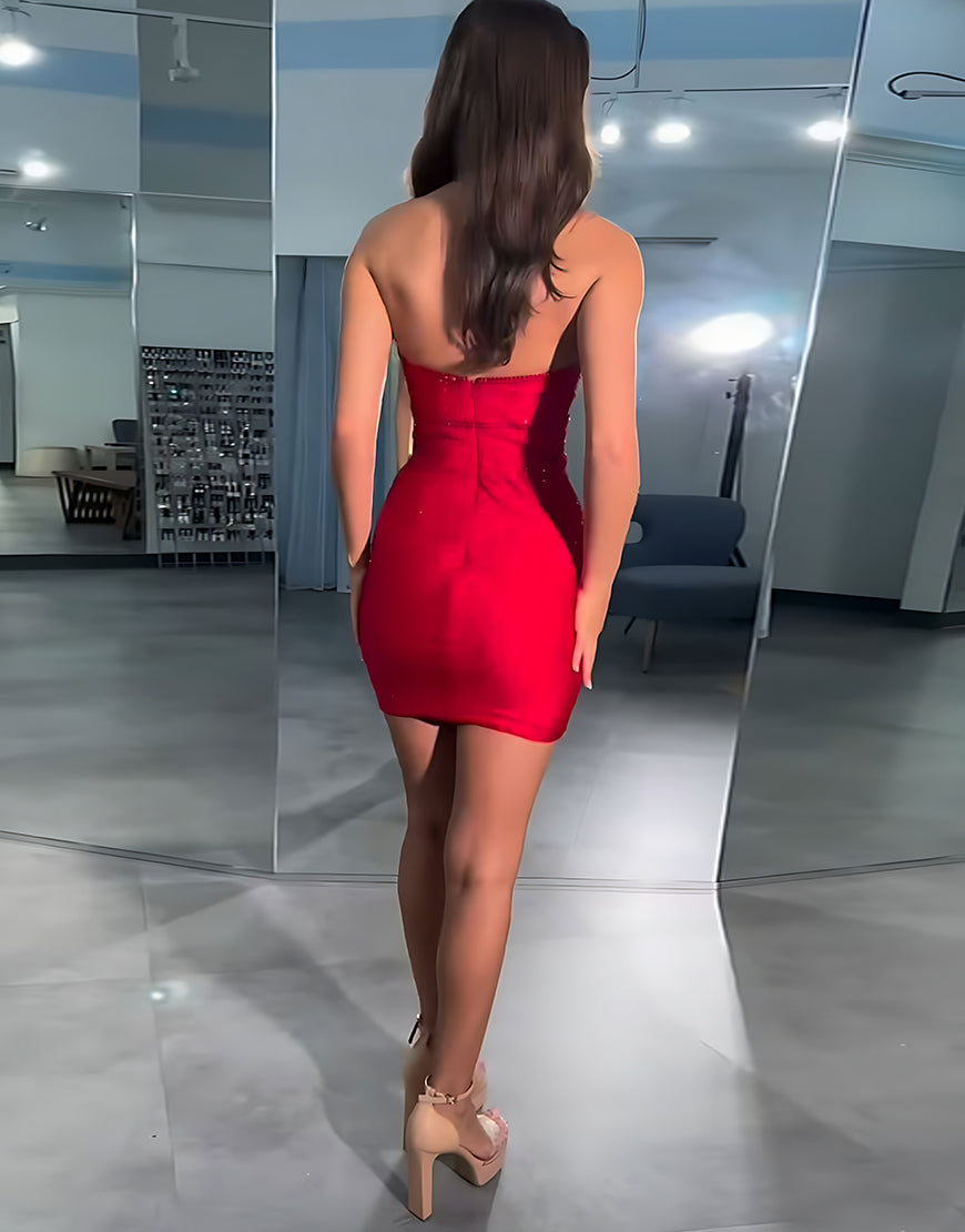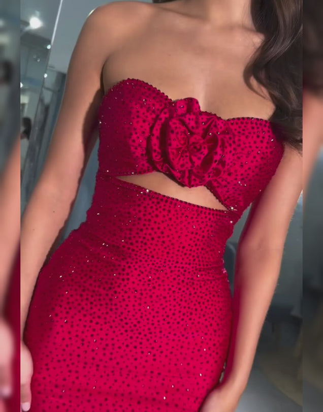 Sparkly Strapless Red Floral Cut Out Tight Homecoming Dress