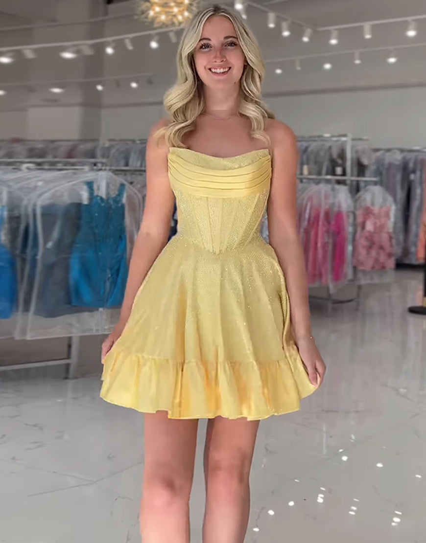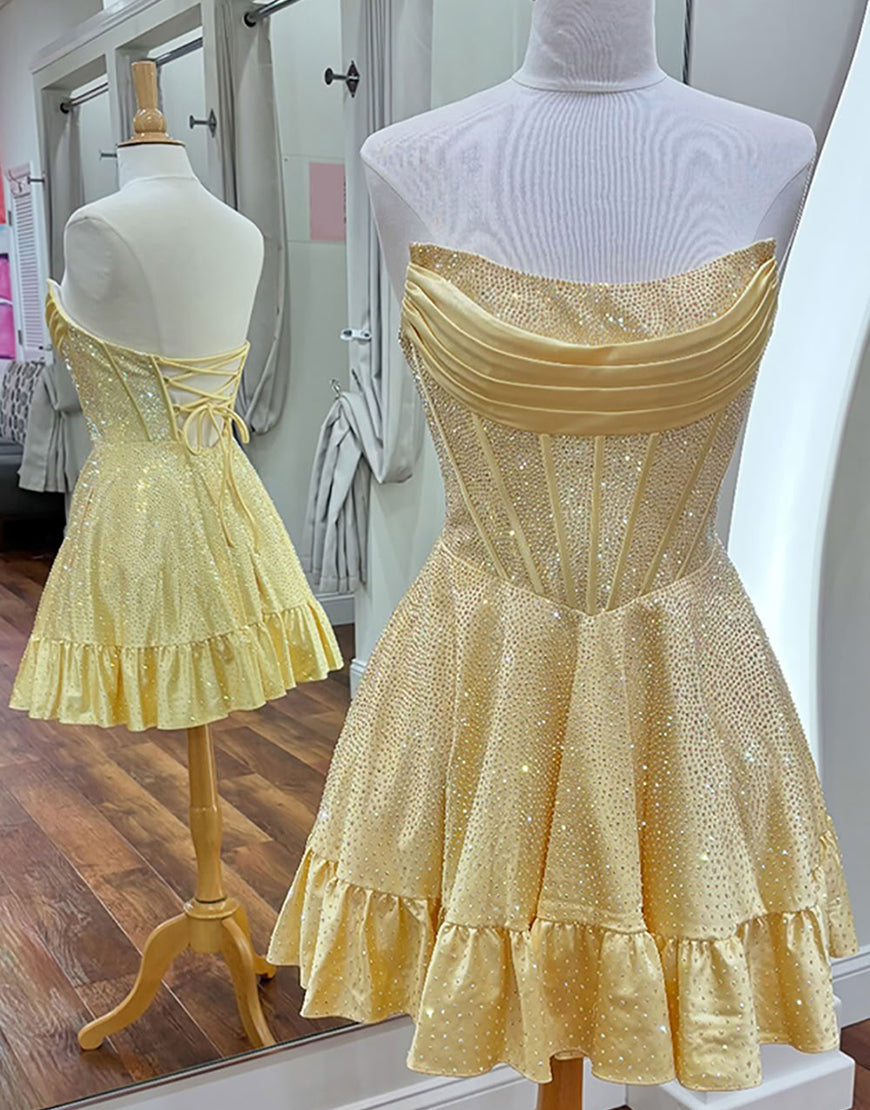Sparkly Yellow Strapless Satin Mini Homecoming Dress with Basque Waist