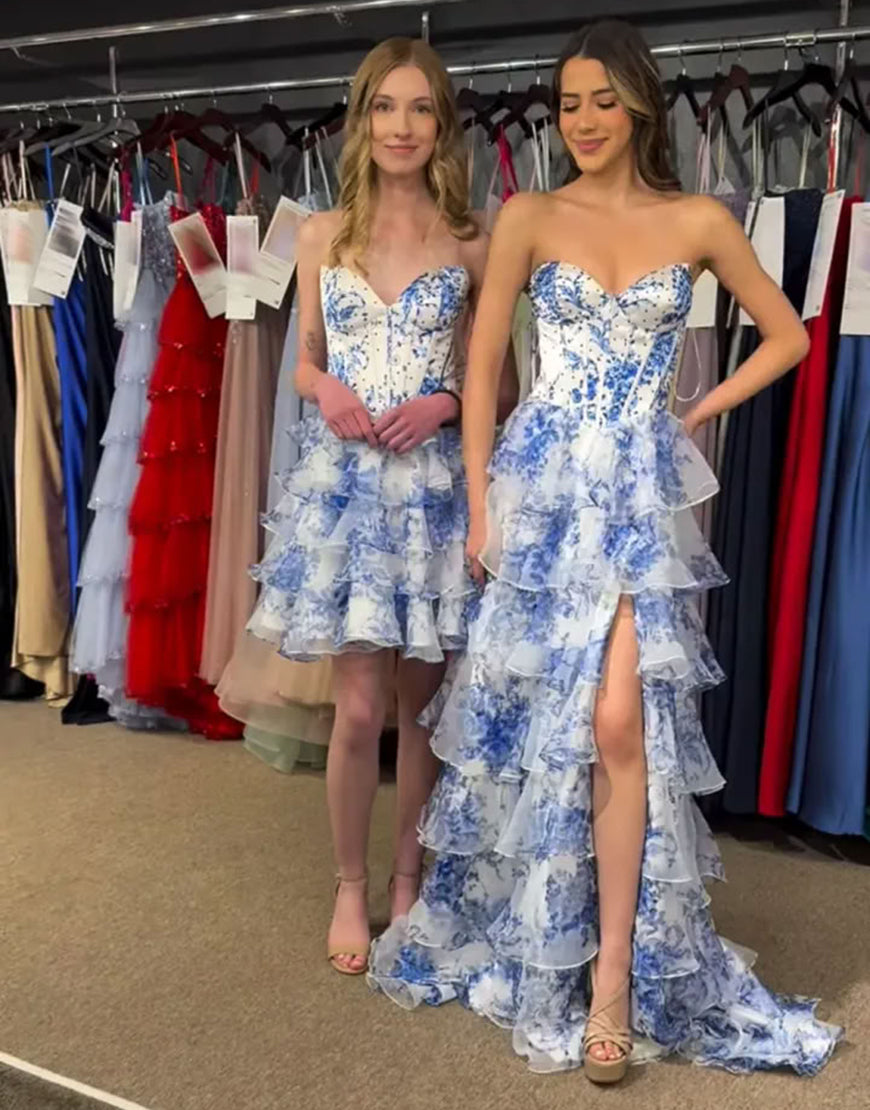 Blue Floral Corset A-Line Strapless Short Homecoming Dress