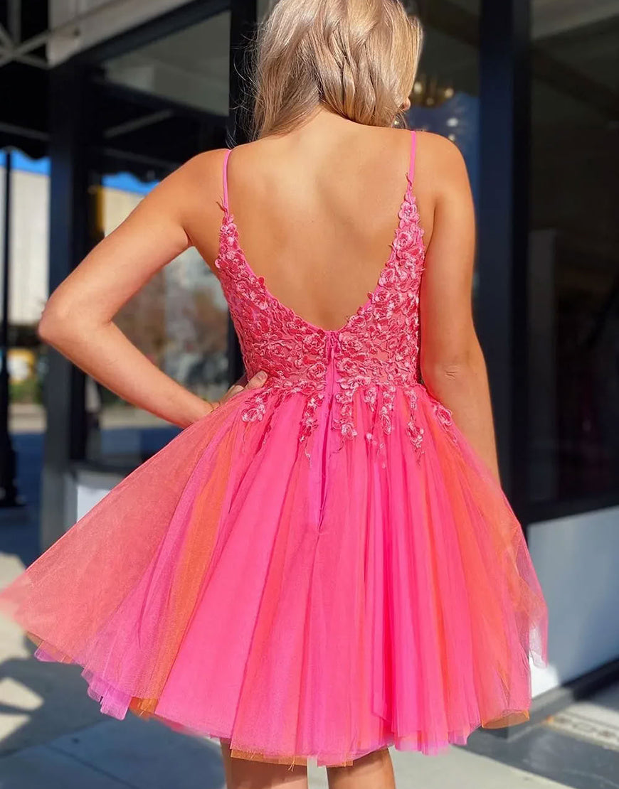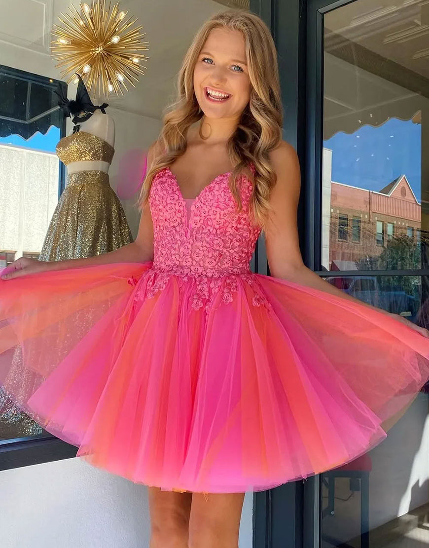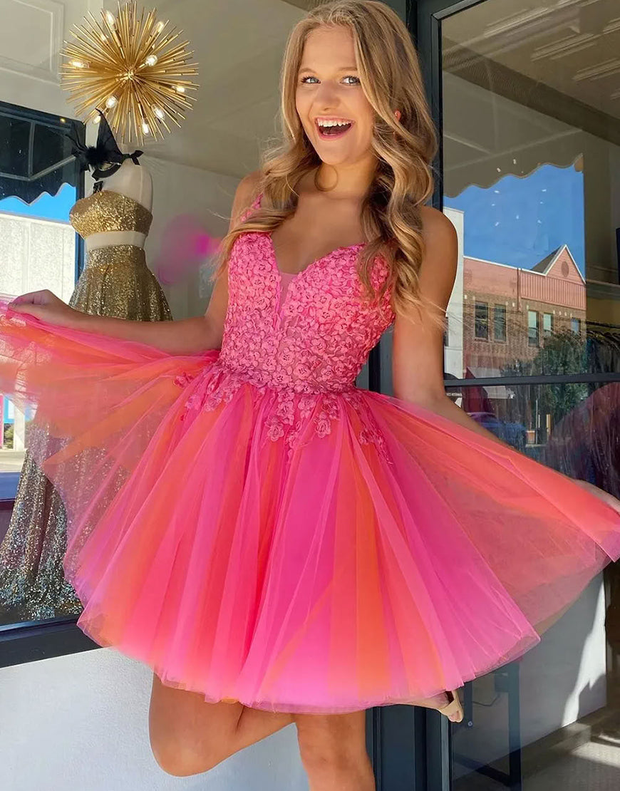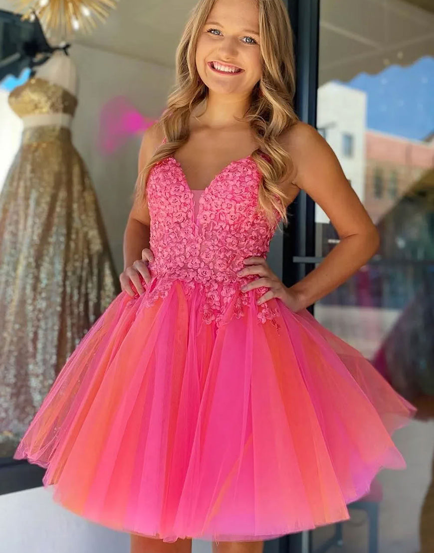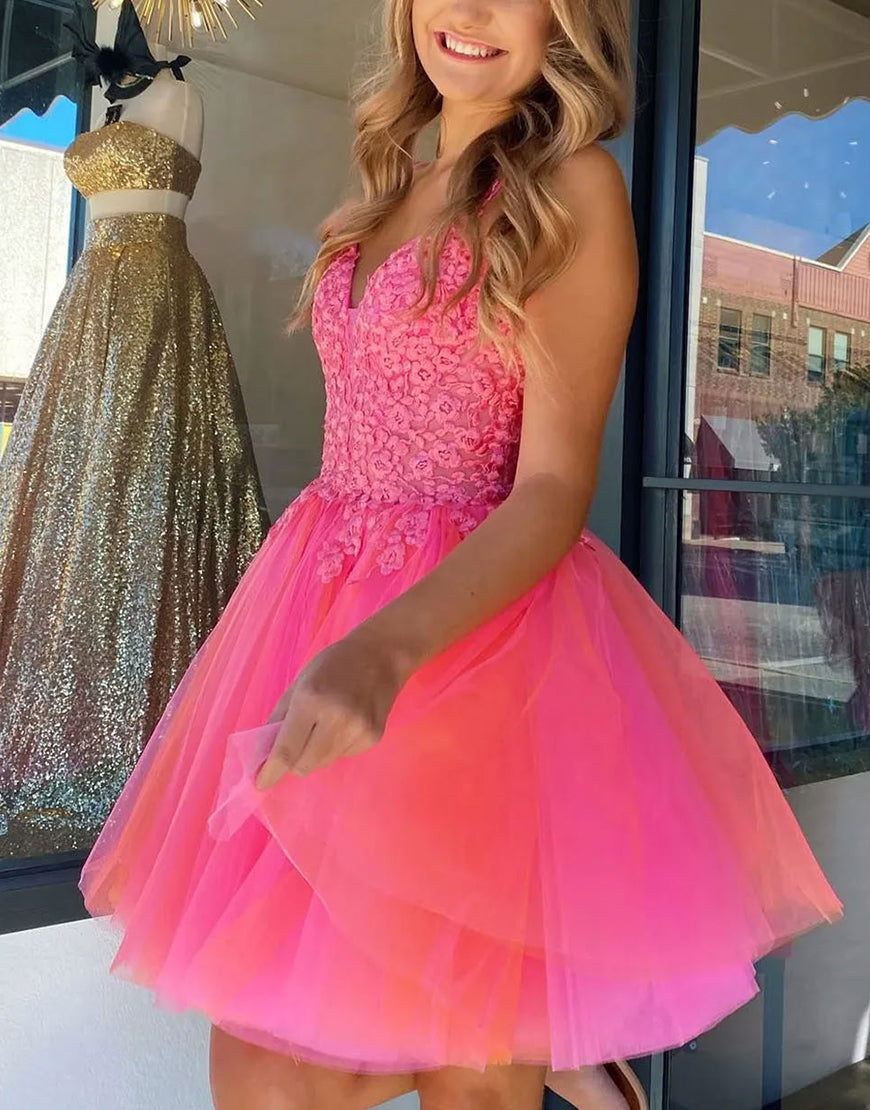 Hot Pink Tulle A-Line Short Homecoming Dress with Lace