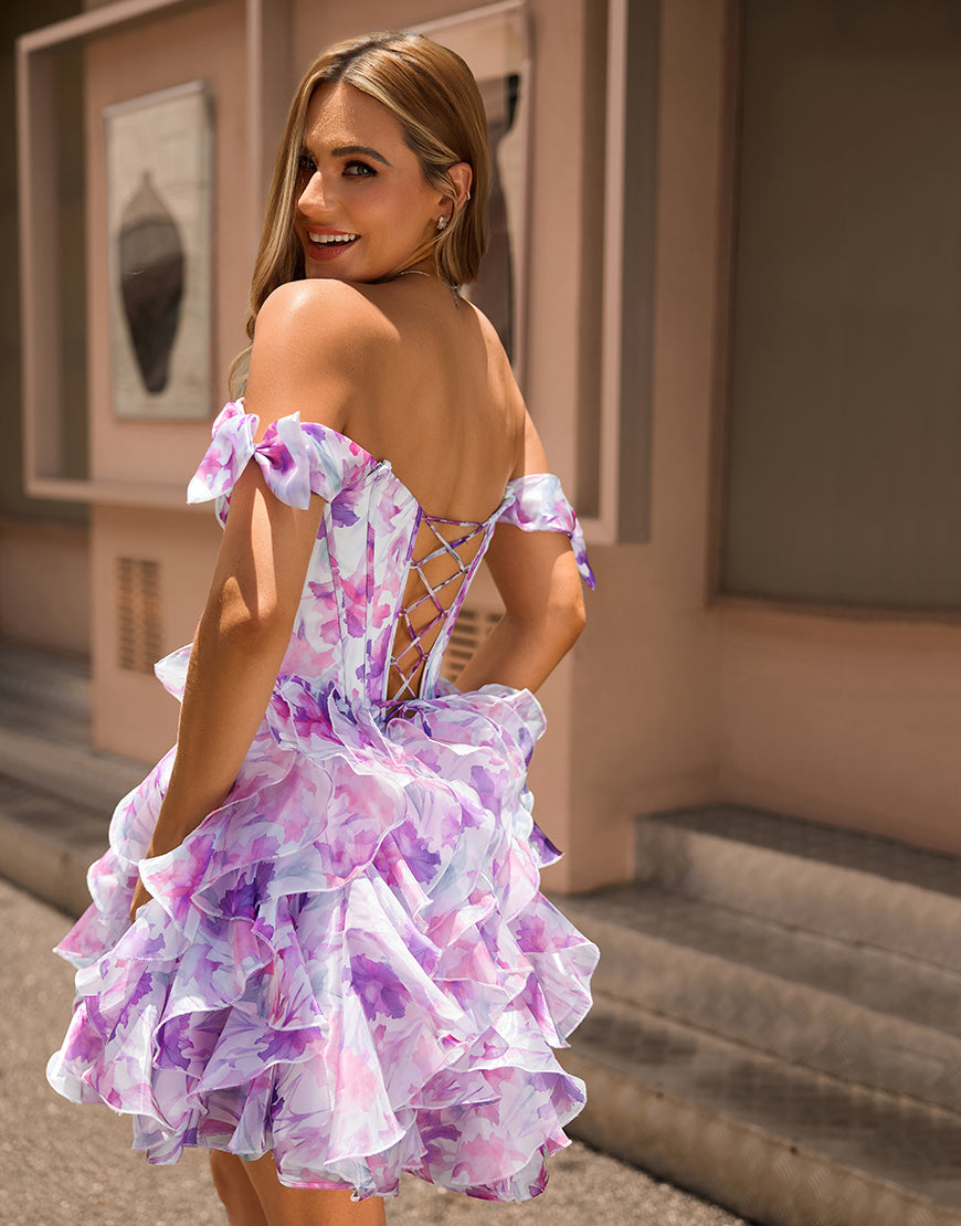 Off The Shoulder Printed Ruffle Corset A-Line Purple Homecoming Dress