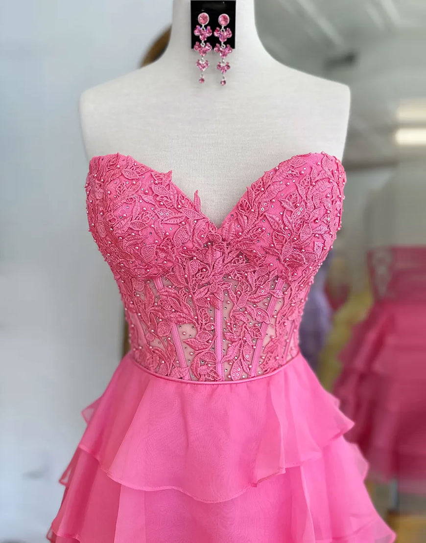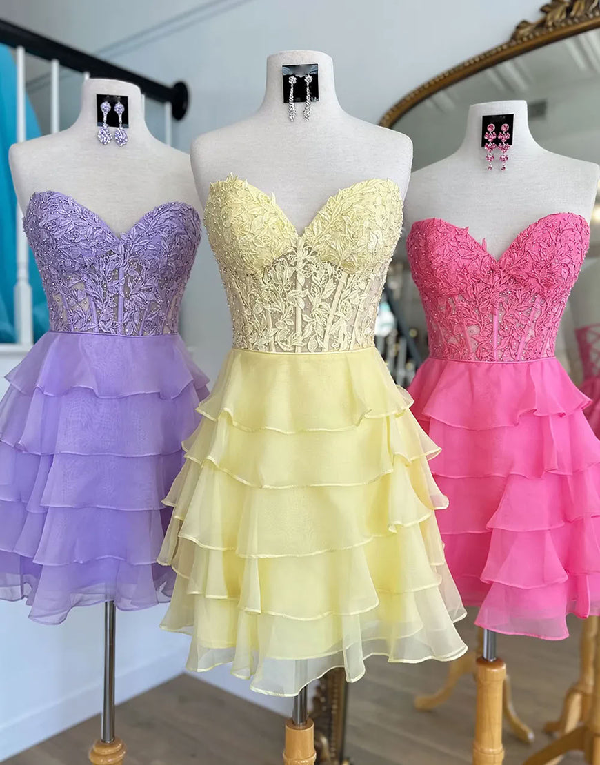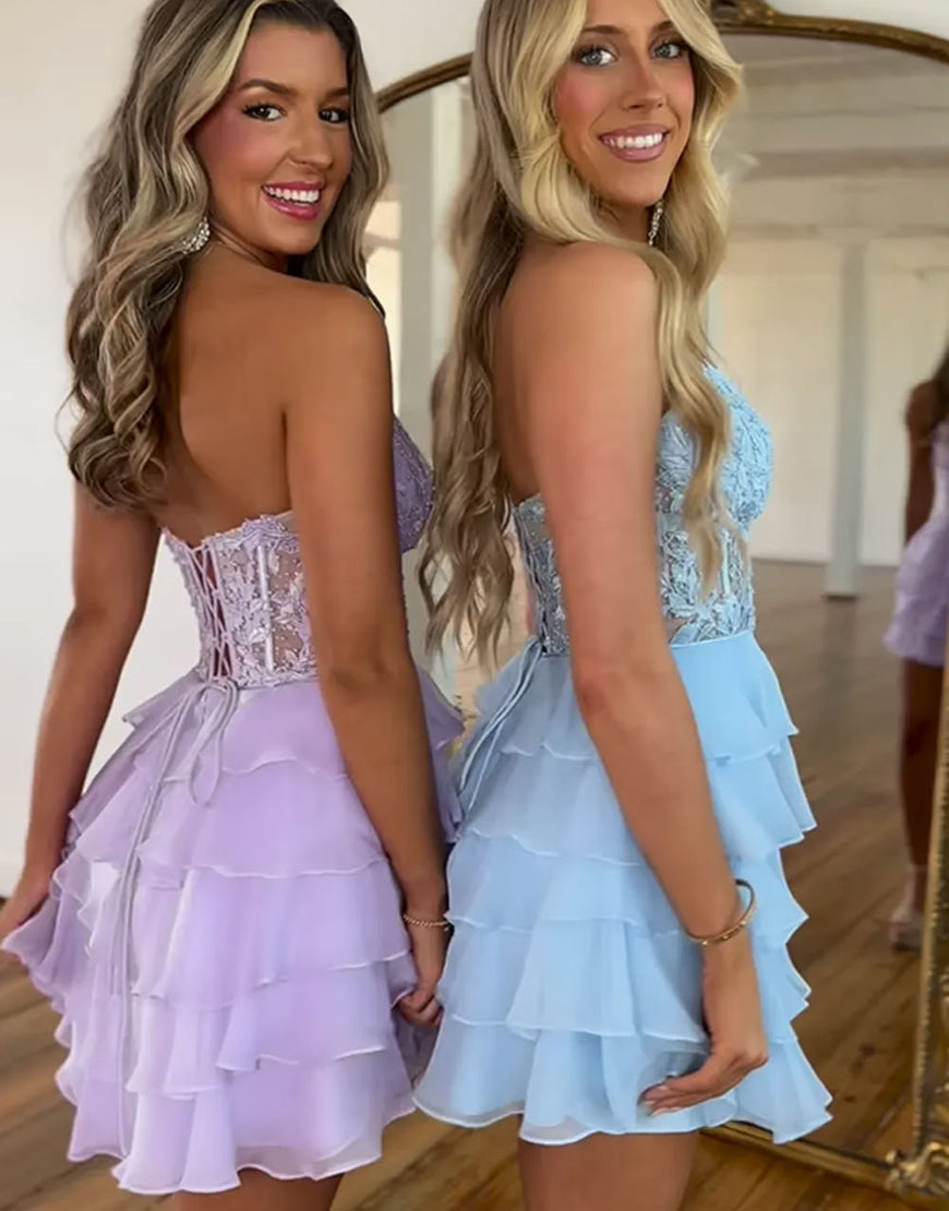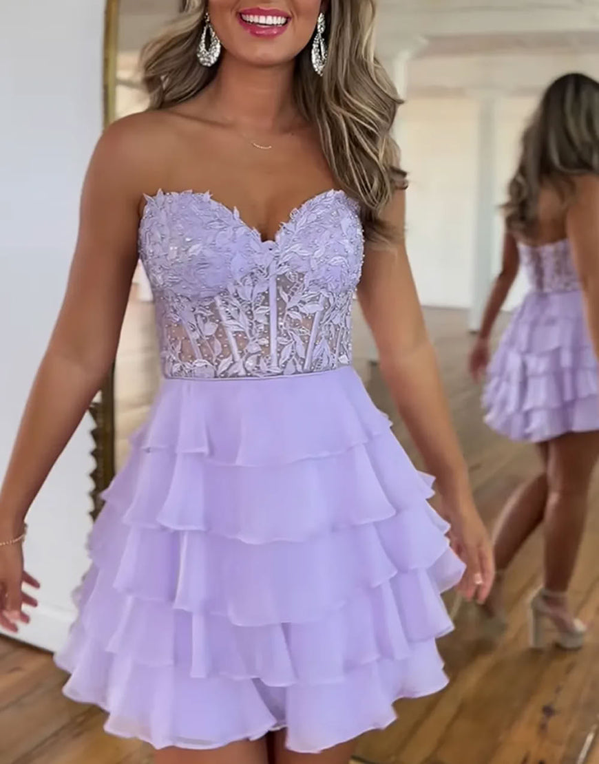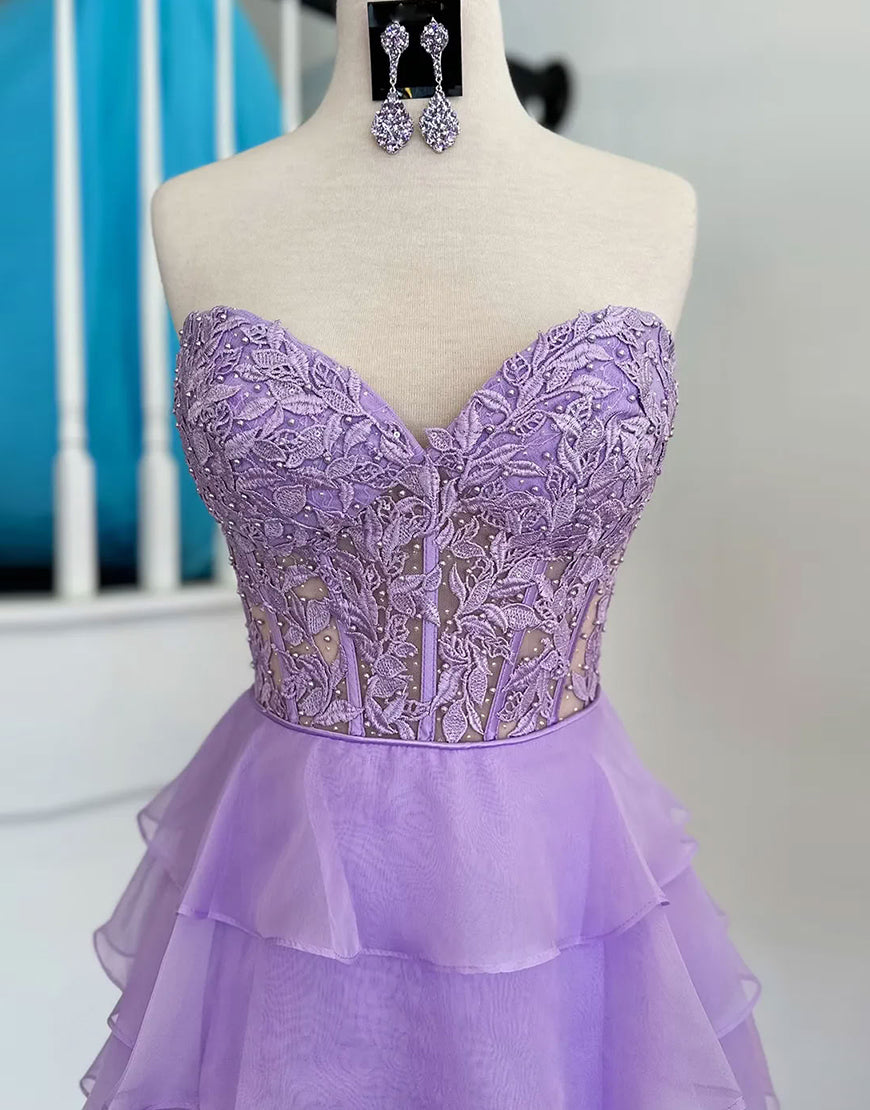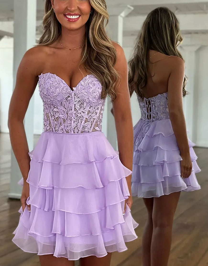 Tiered A Line Strapless Short Lilac Homecoming Dress with Appliques