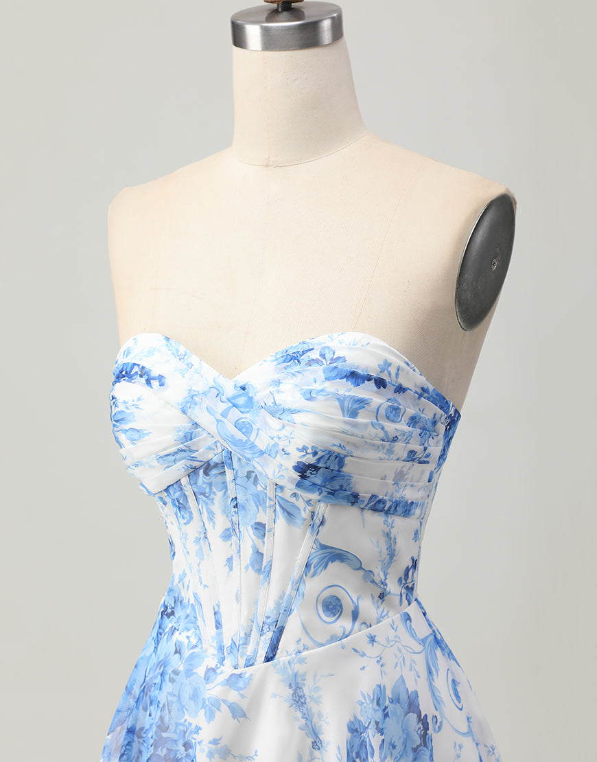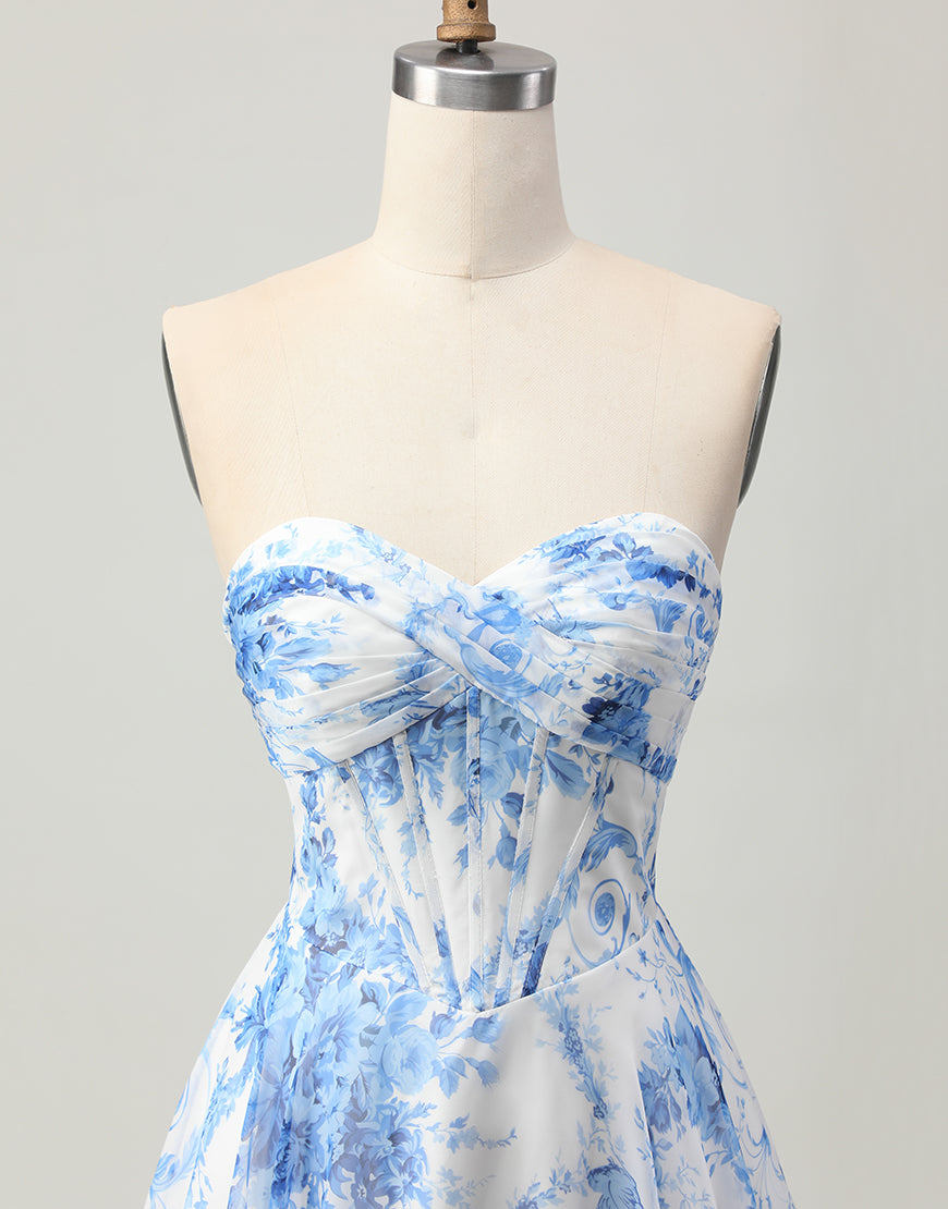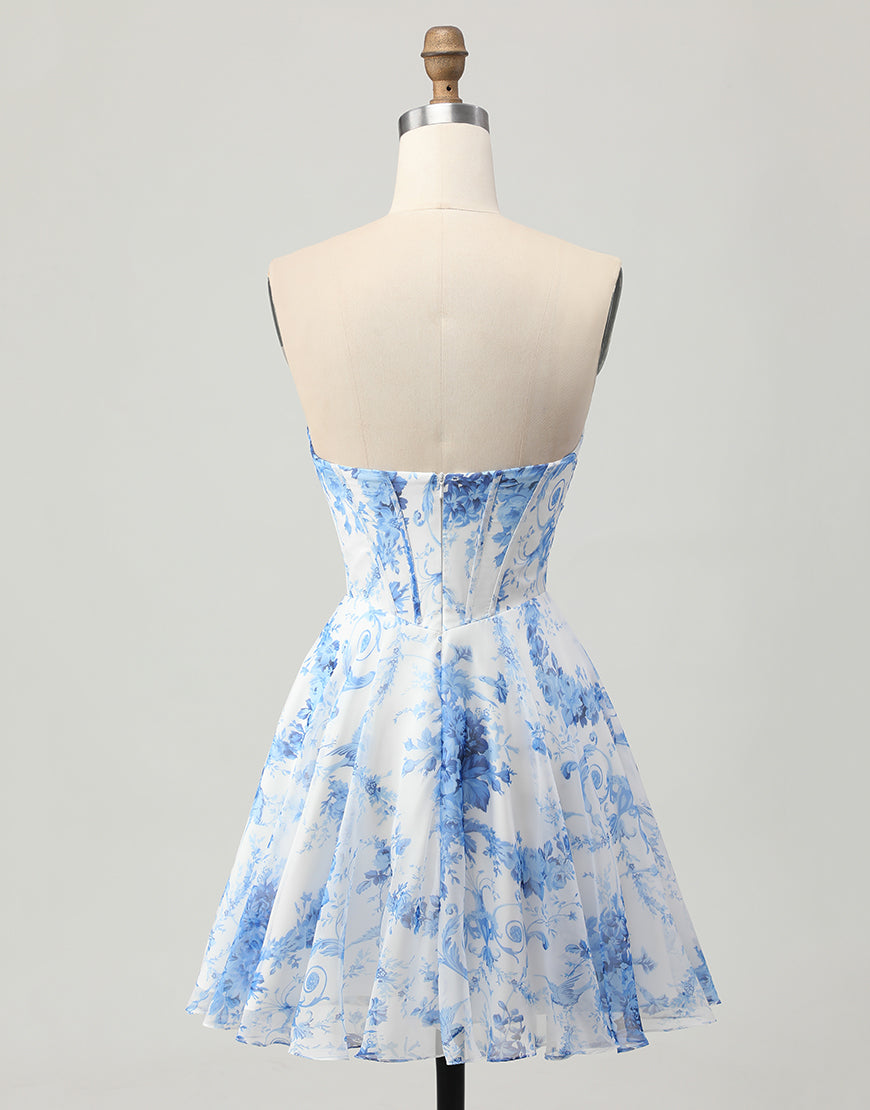 White Blue Floral A Line Strapless Corset Homecoming Dress