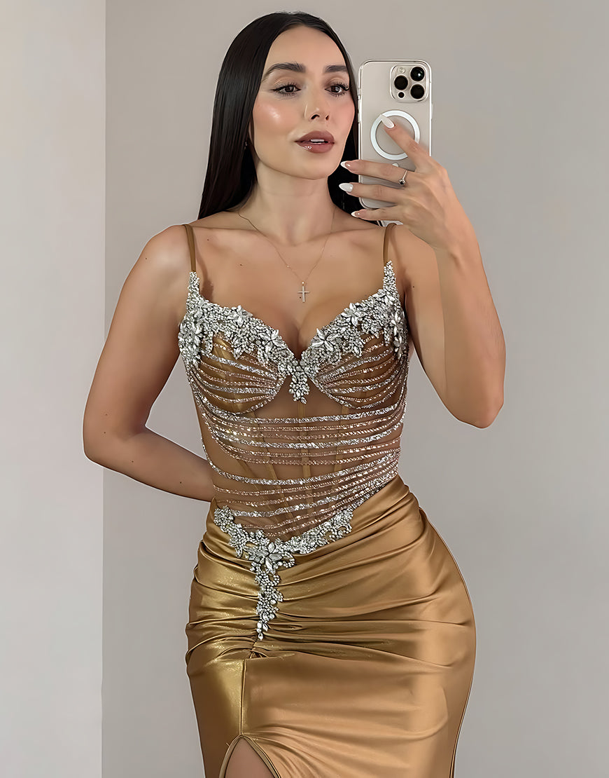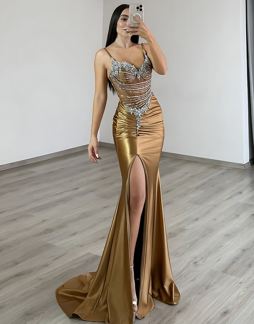 Sparkly Dark Golden Mermaid Spaghetti Straps Prom Dress