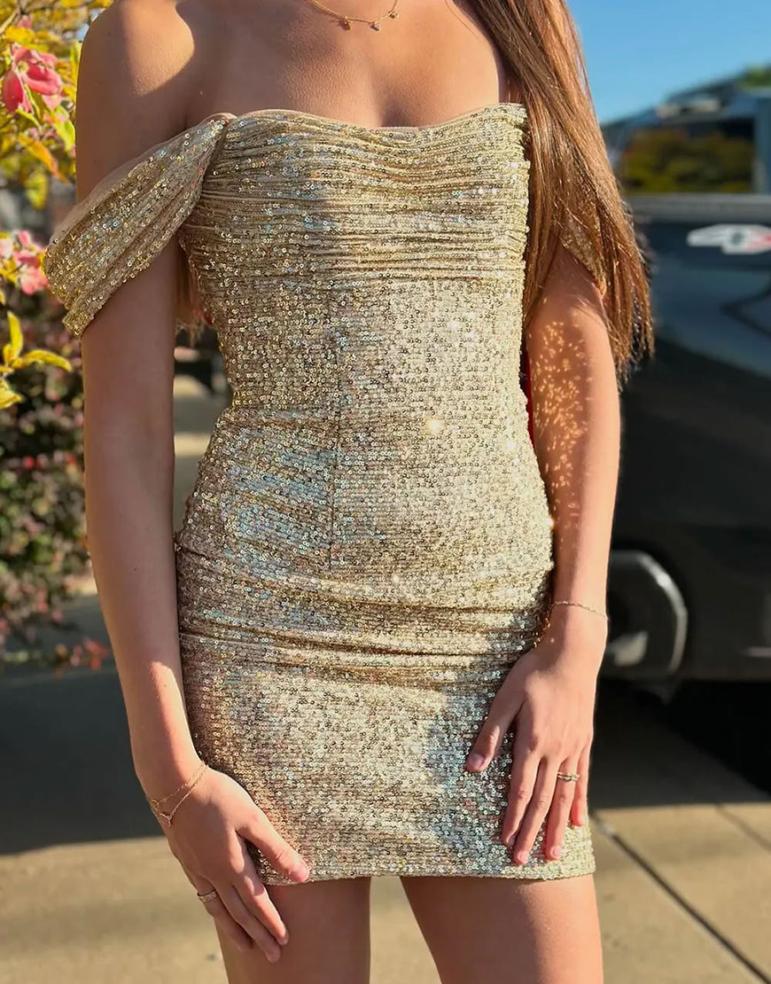 Off The Shoulder Gold Sequins Tight Homecoming Dress