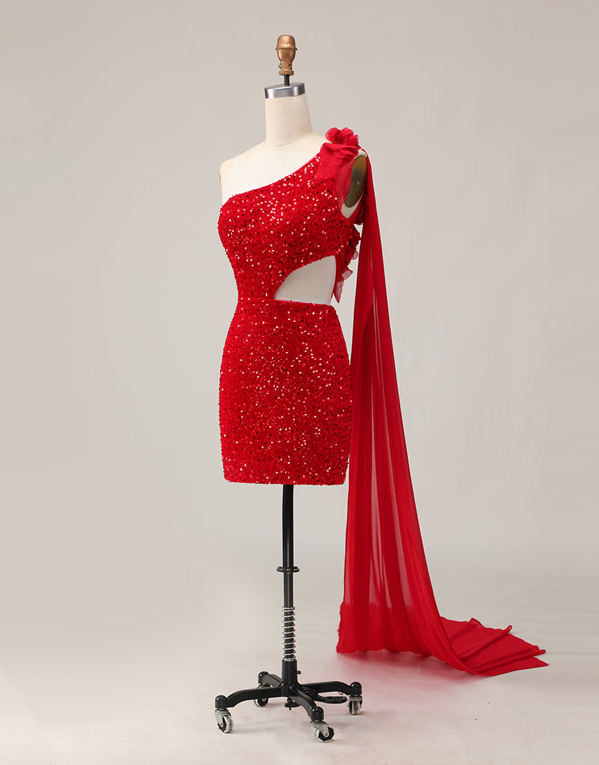 One Shoulder Red Sequined Cut-Out Bodycon Homecoming Dress With Streamer