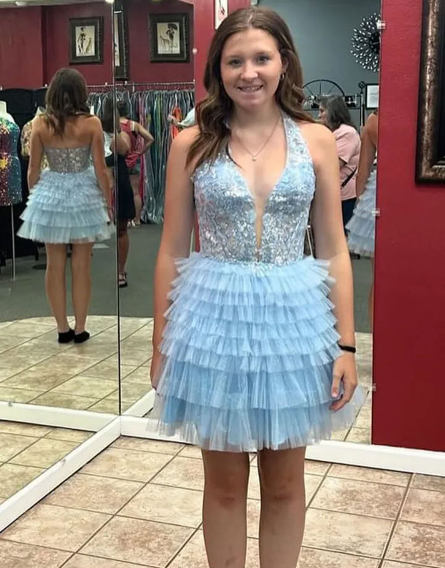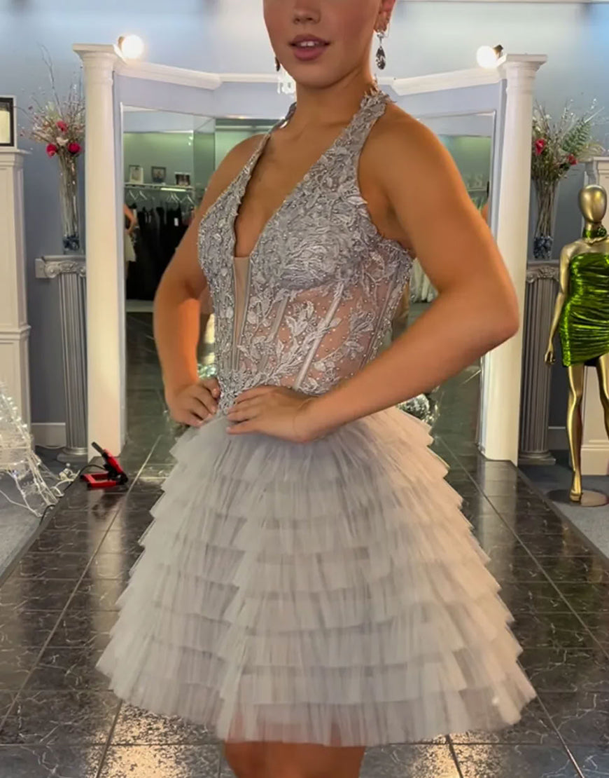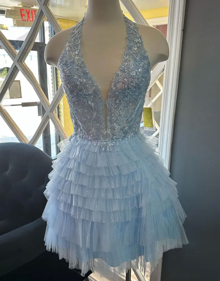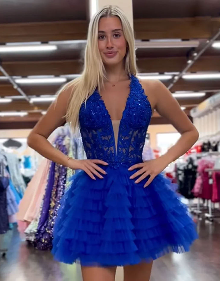 Halter Royal Blue A Line Tiered Corset Homecoming Dress with Appliques