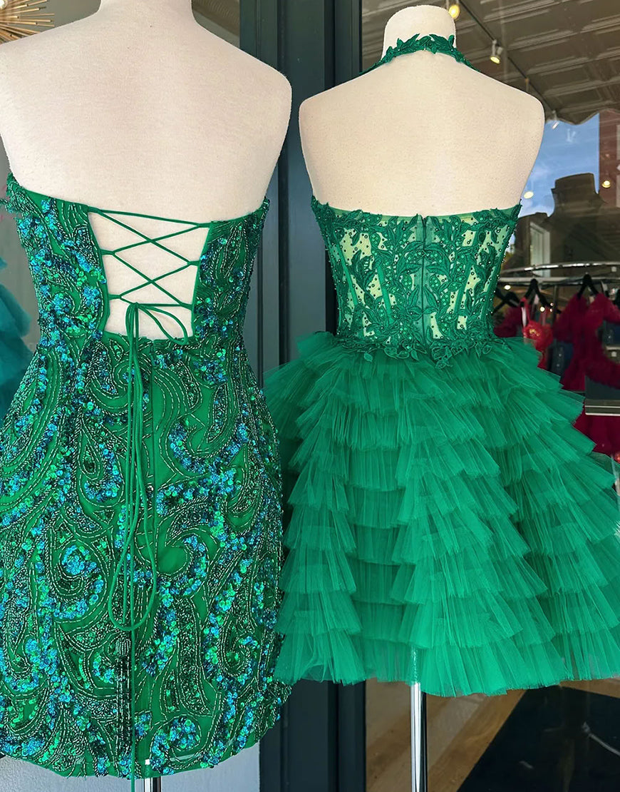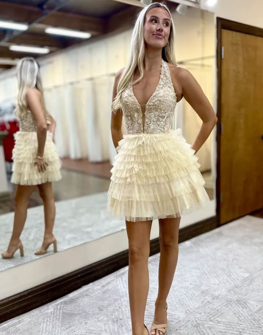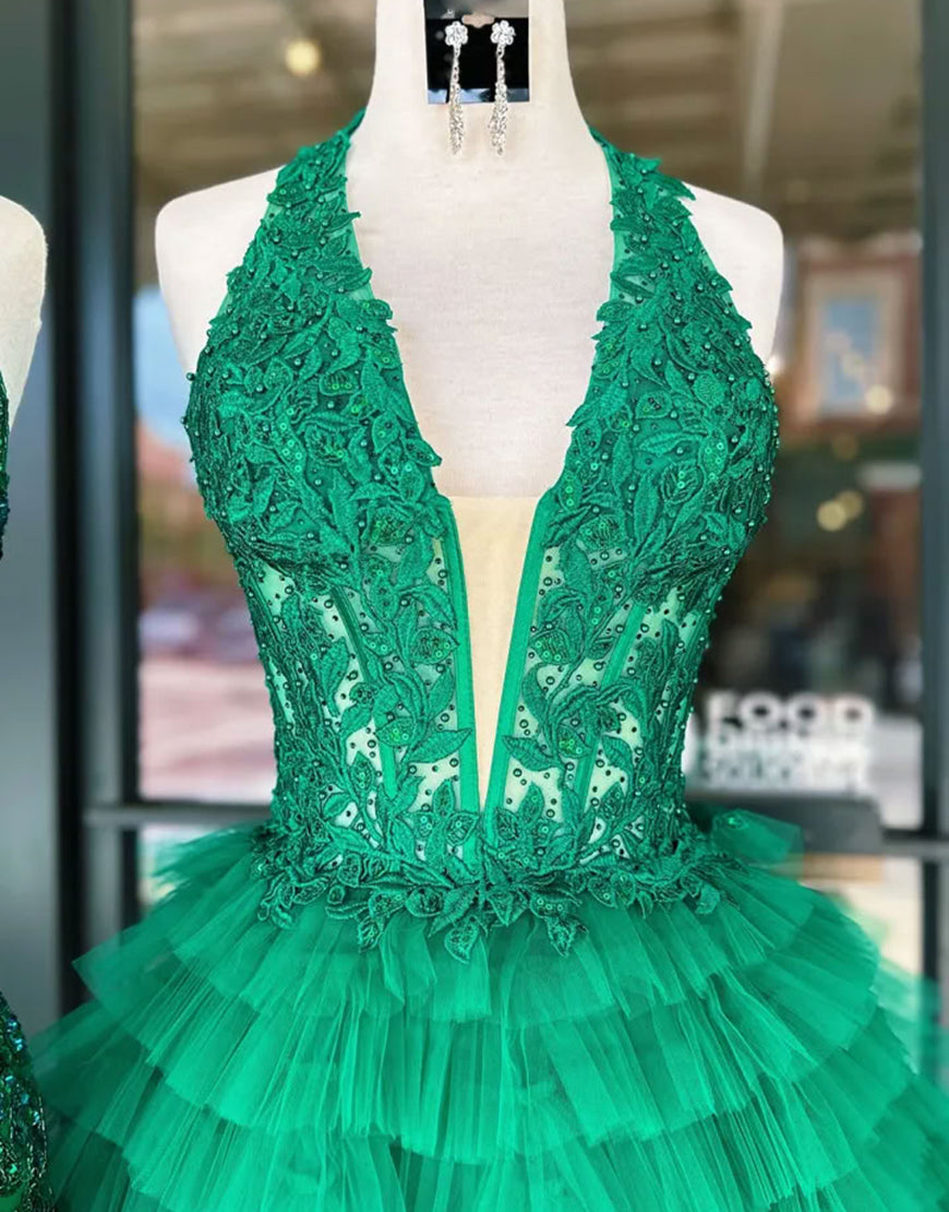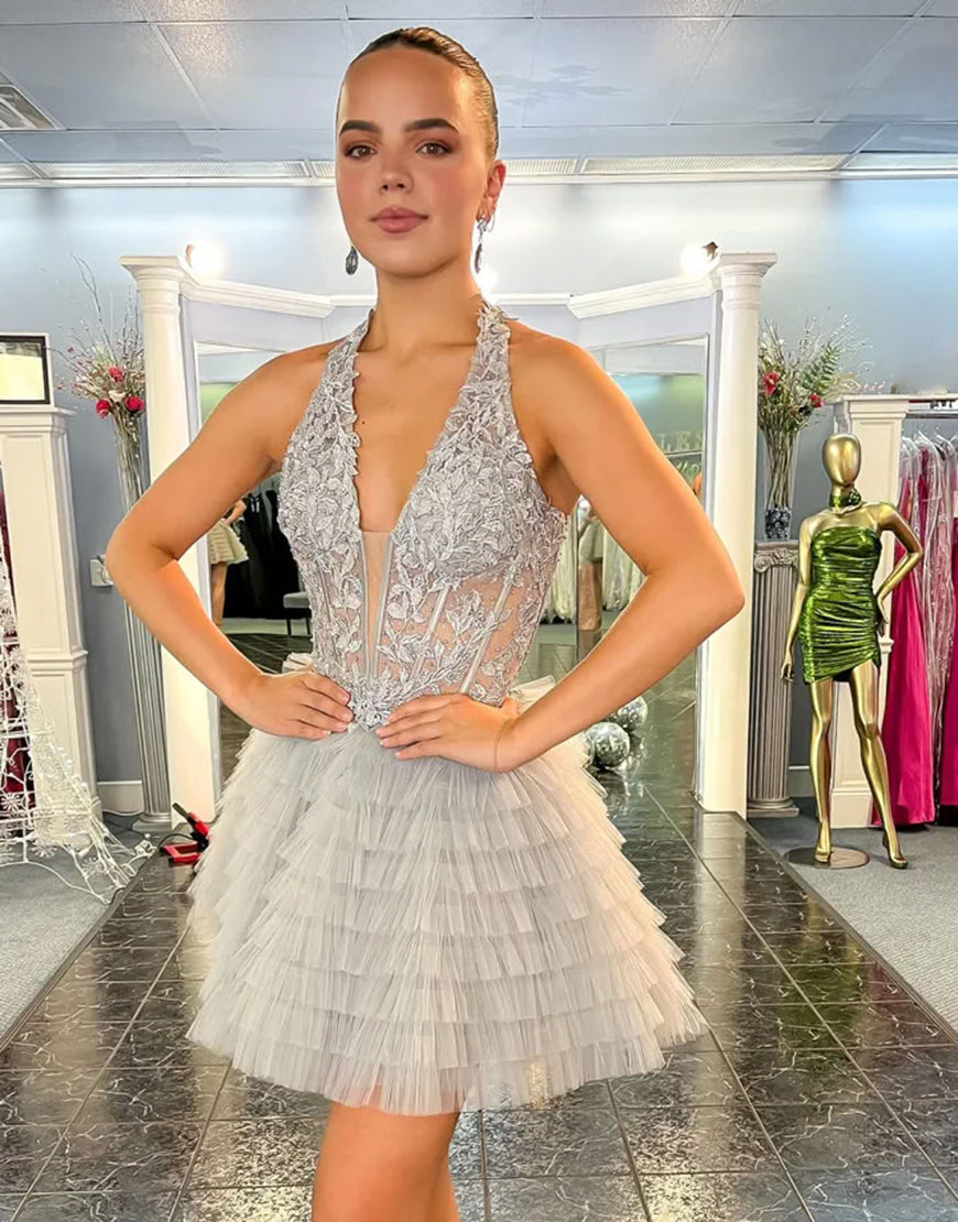 Halter Royal Blue A Line Tiered Corset Homecoming Dress with Appliques
