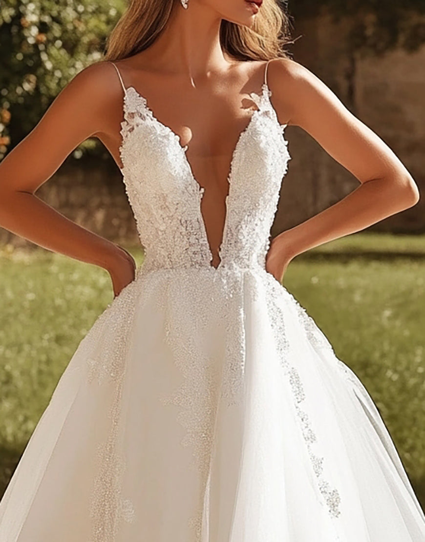 Charming Ivory A Line Tulle Wedding Dress with Lace Appliques