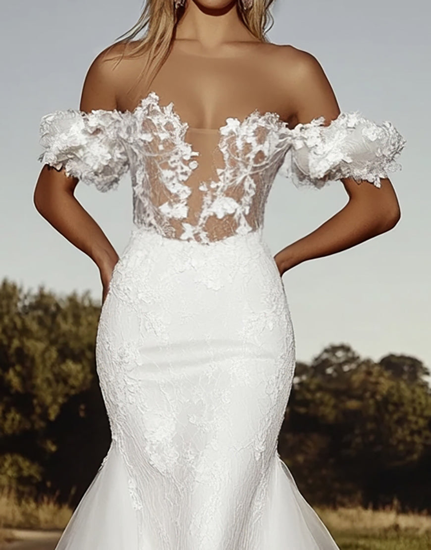 Delicate Ivory A Line Off the Shoulder Tulle Lace Wedding Dress