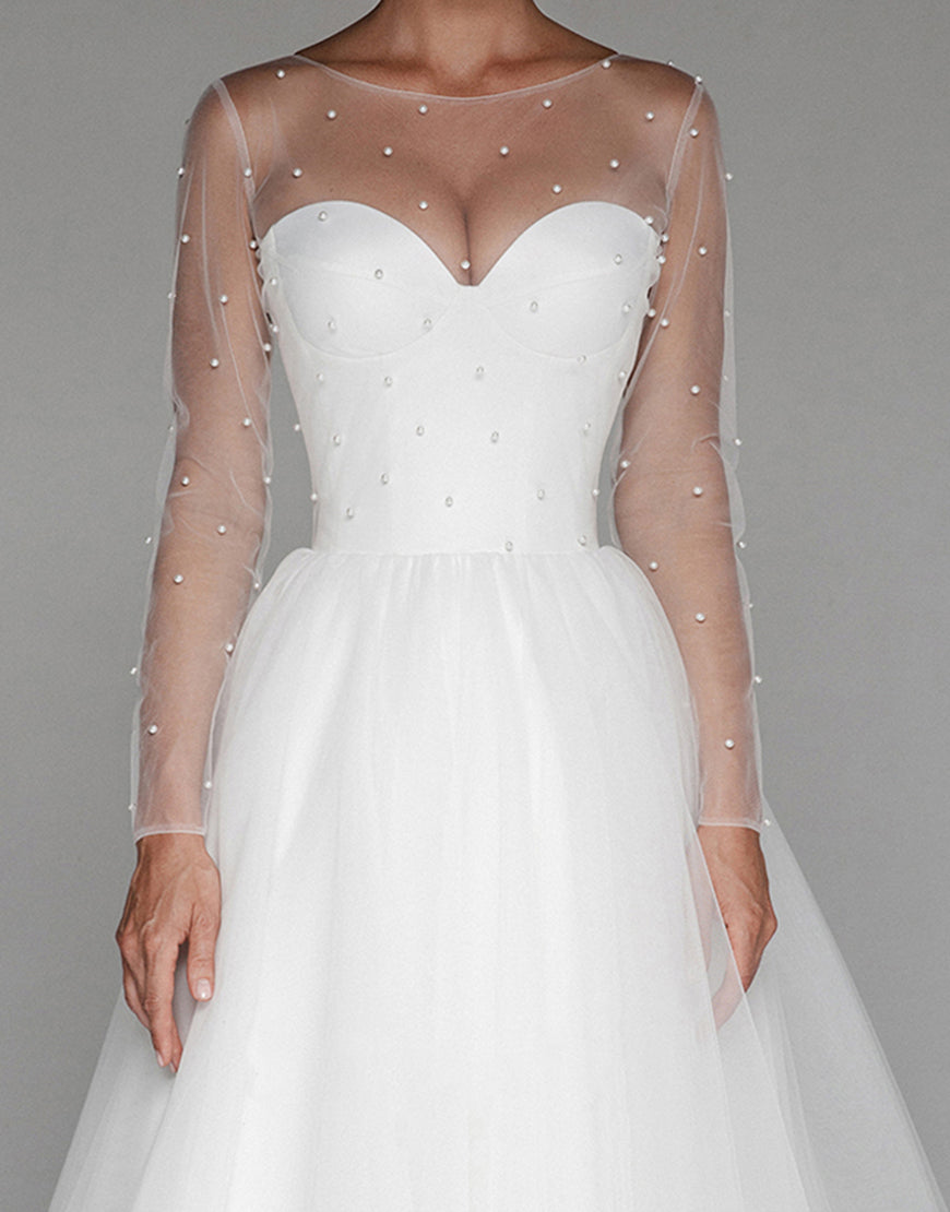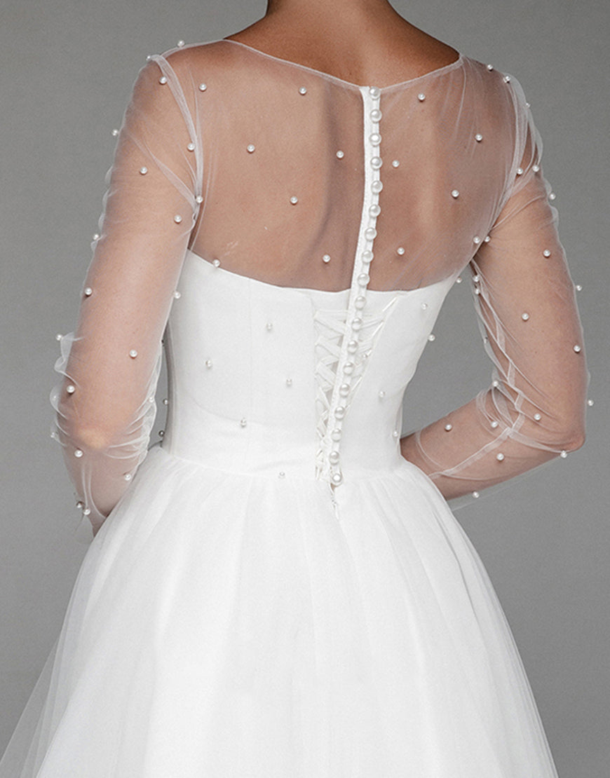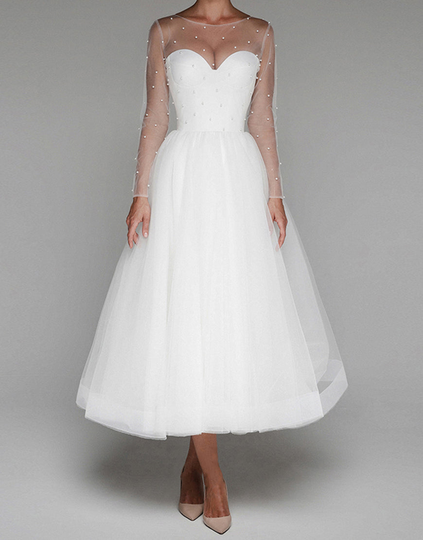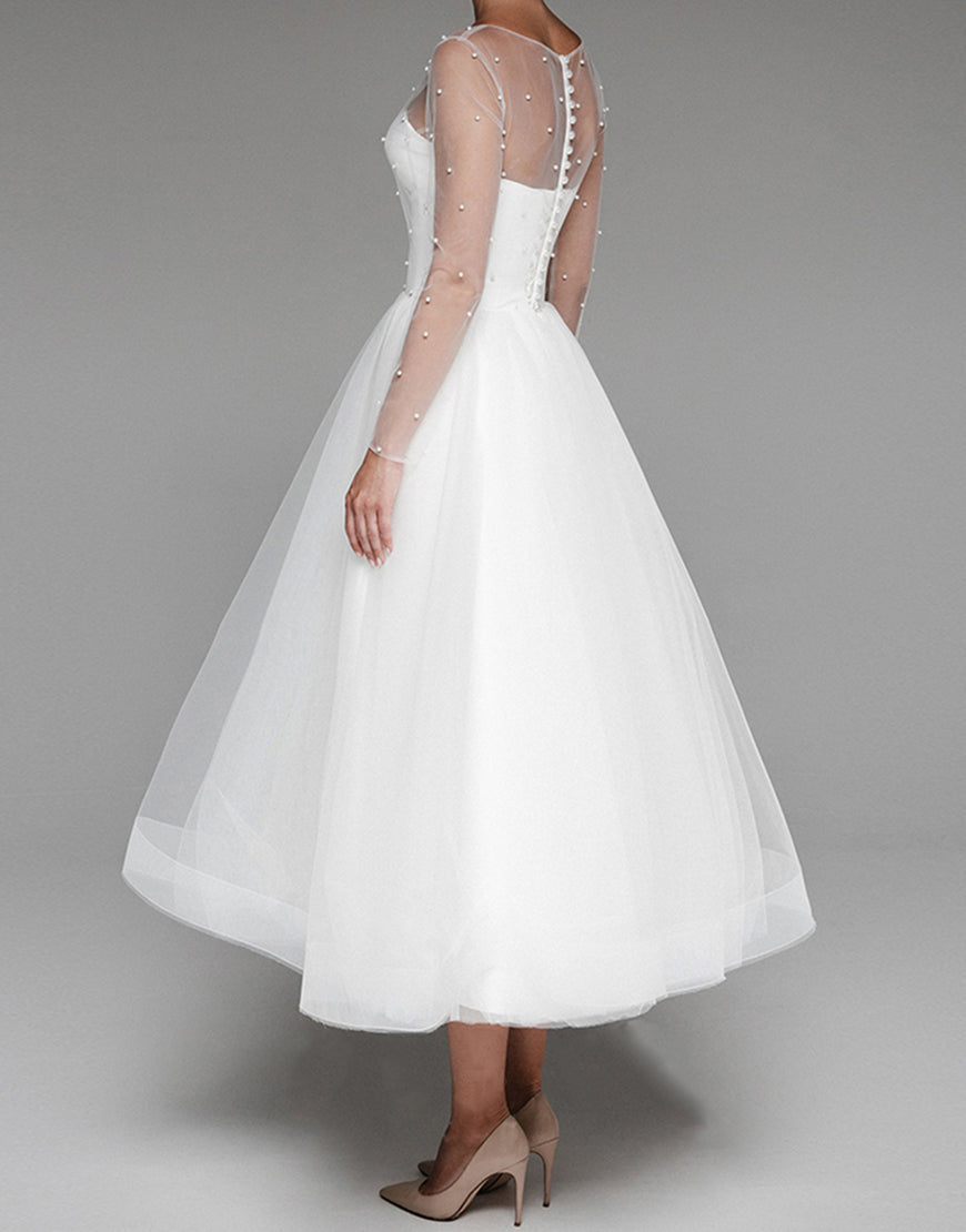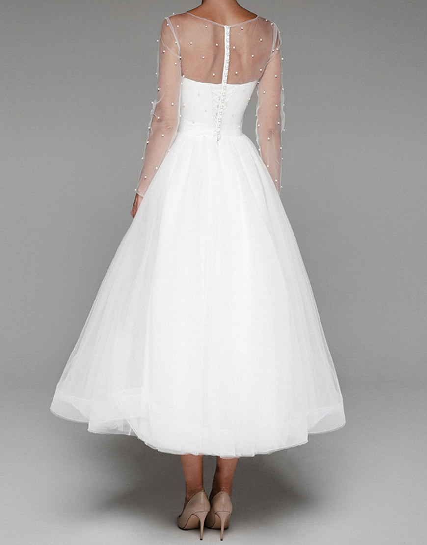 Illusion Neck White A Line Beaded Midi Wedding Dress