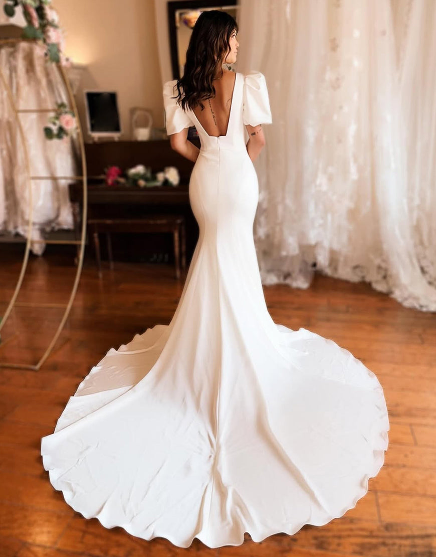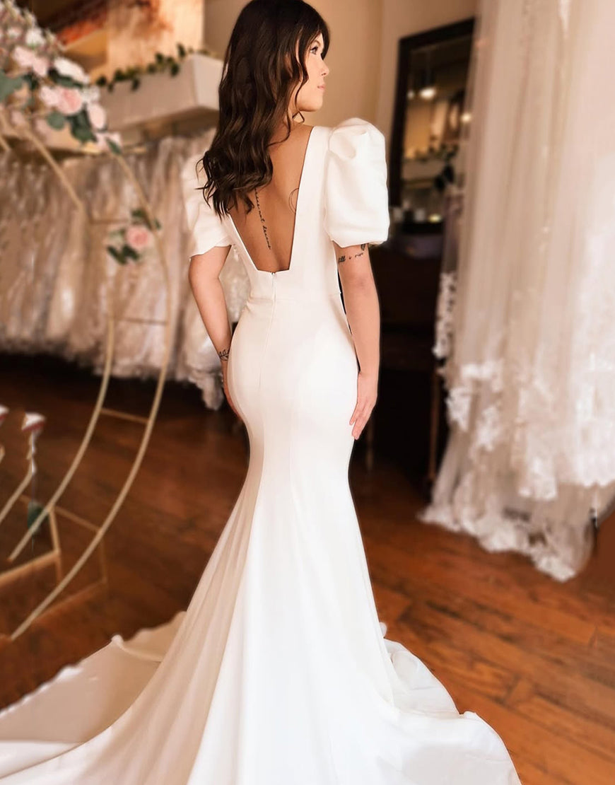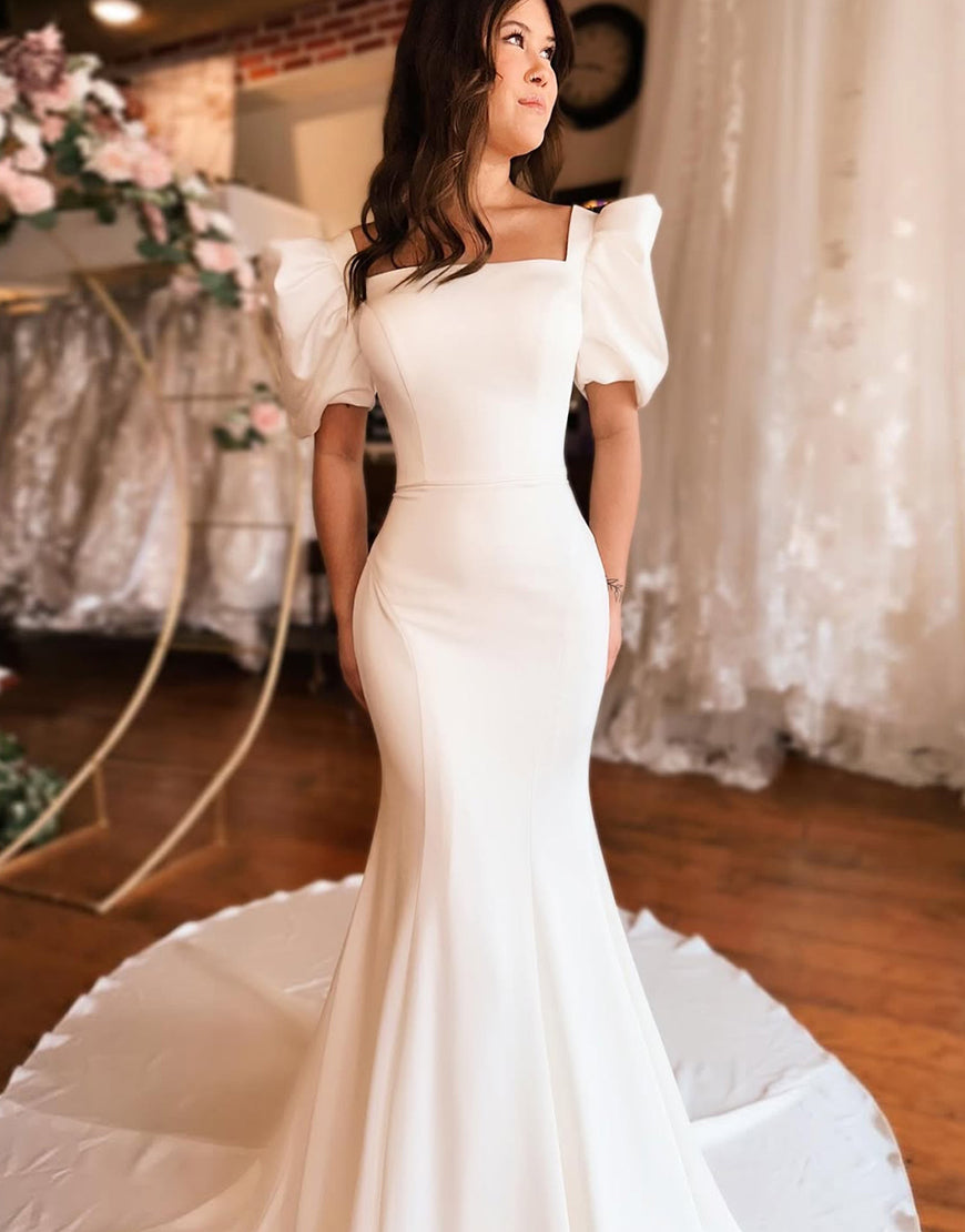 Mermaid Satin White Wedding Dress with Puff Sleeves