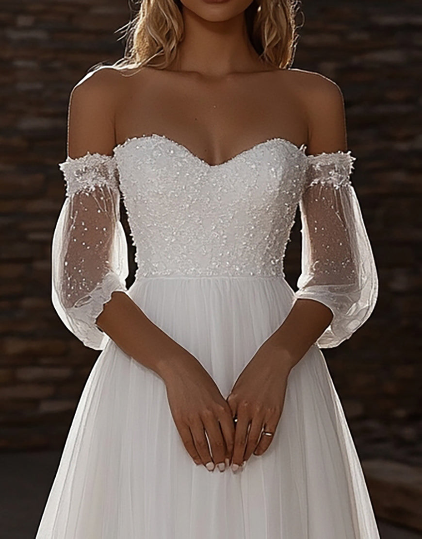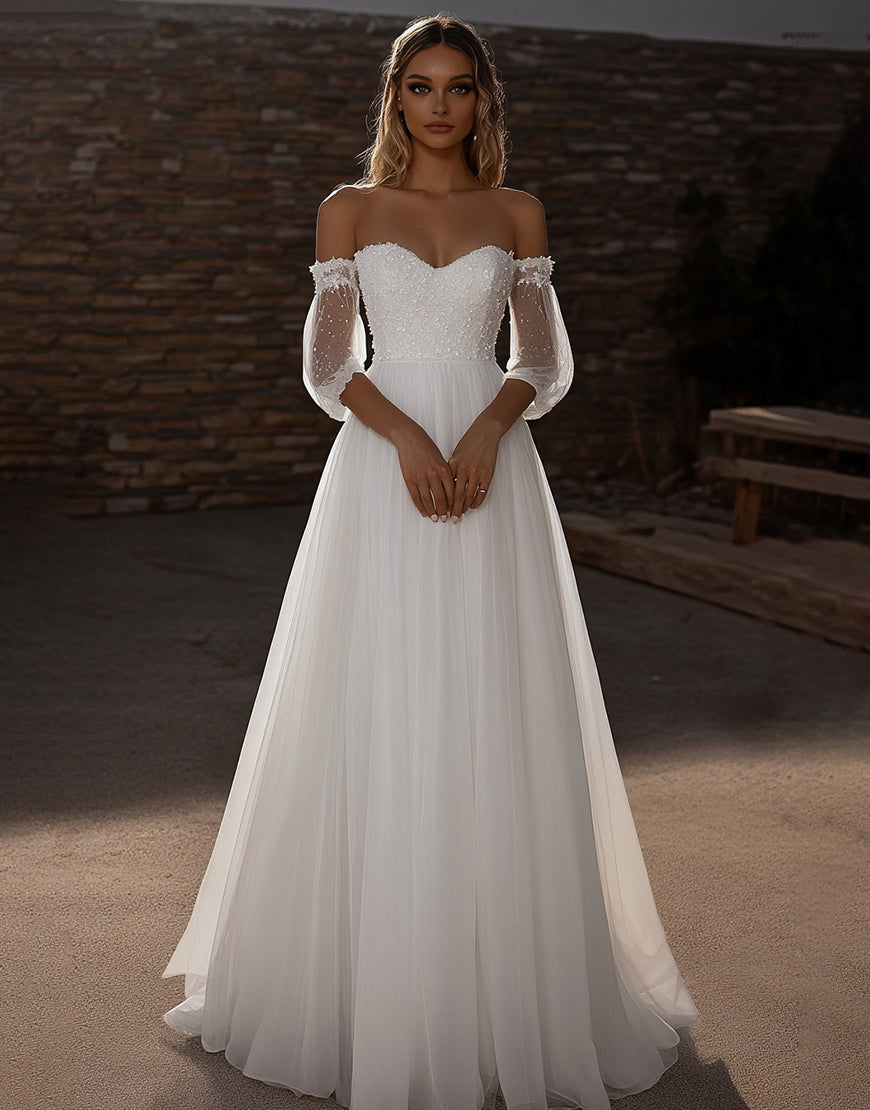 Sweetheart A Line Tulle Half Illusion Sleeve Ivory Wedding Dress