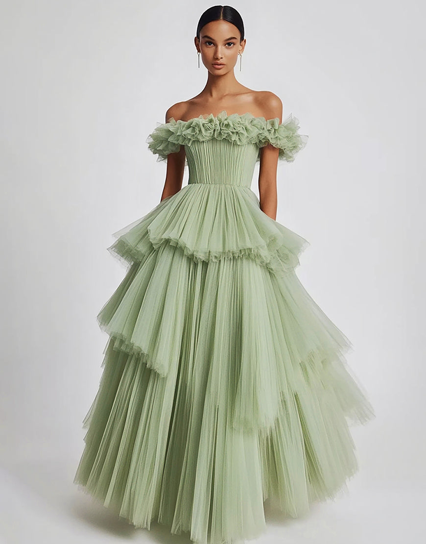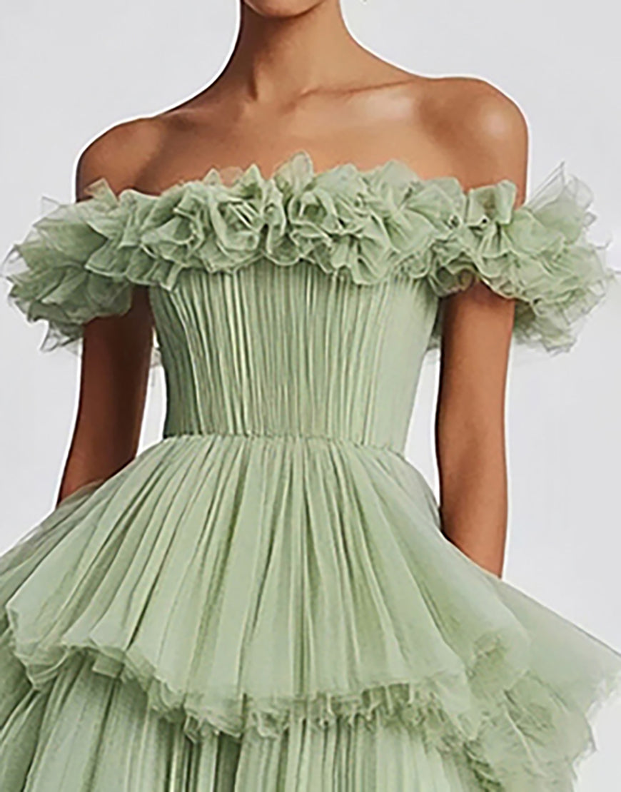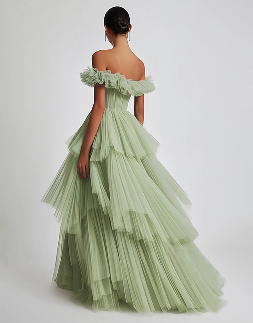 Off the Shoulder Dusty Sage A Line Tired Bridesmaid Dress