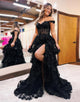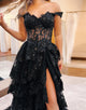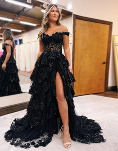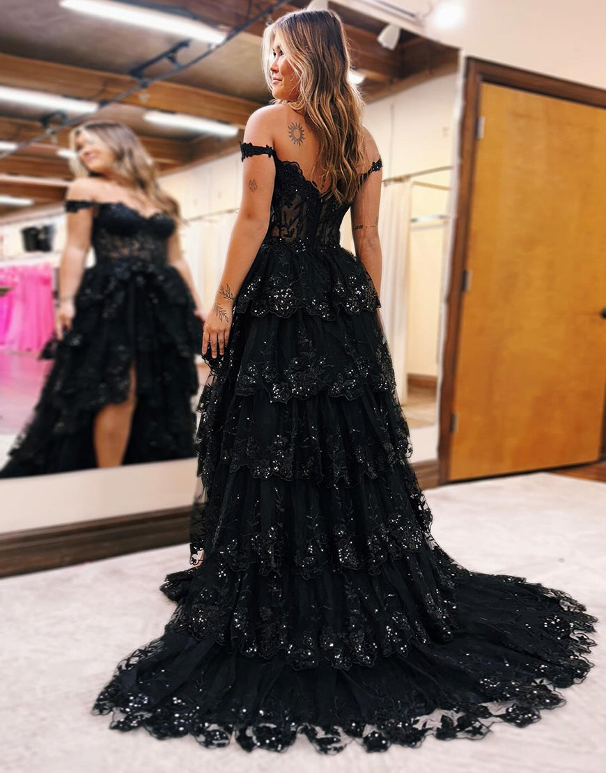 Design: This A-Line Black Off The Shoulder Prom Dress is perfect for making a statement at any special occasion. Featuring intricate lace appliques, cascading ruffles, and a sexy leg slit, this dress will have you feeling confident and glamorous. Complete the look with the included accessories set for a truly elegant and polished ensemble.