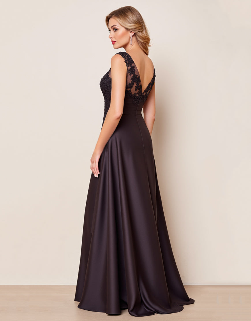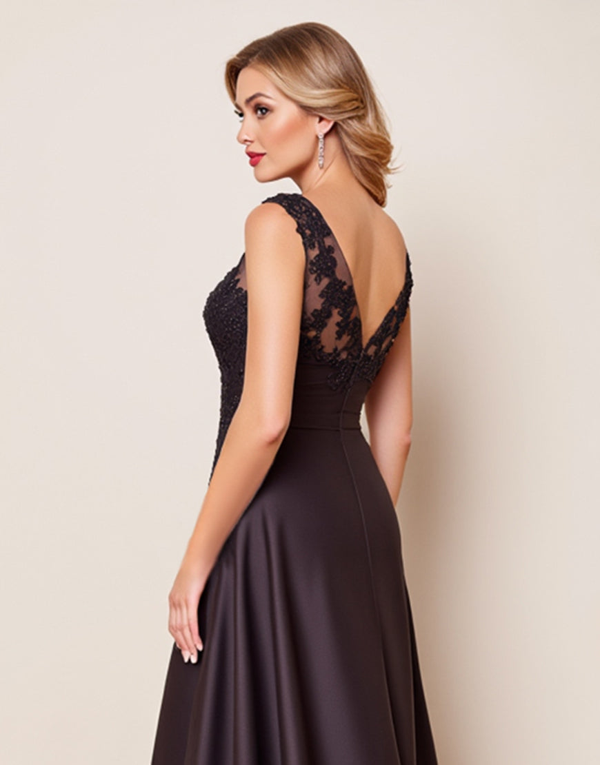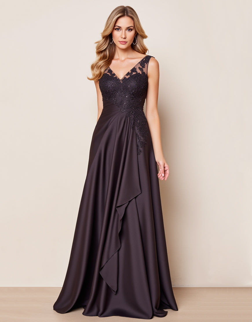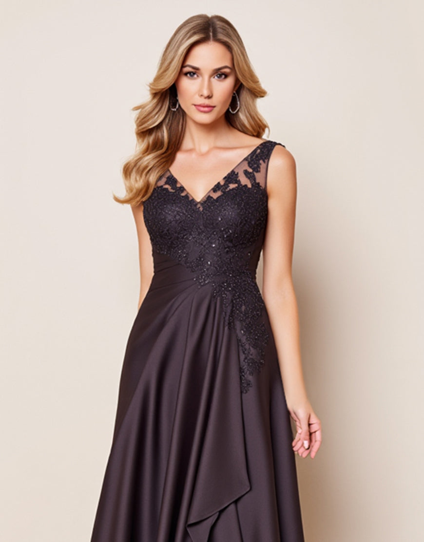 A Line Black V Neck Appliqued Mother Of The Bride Dress