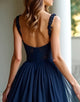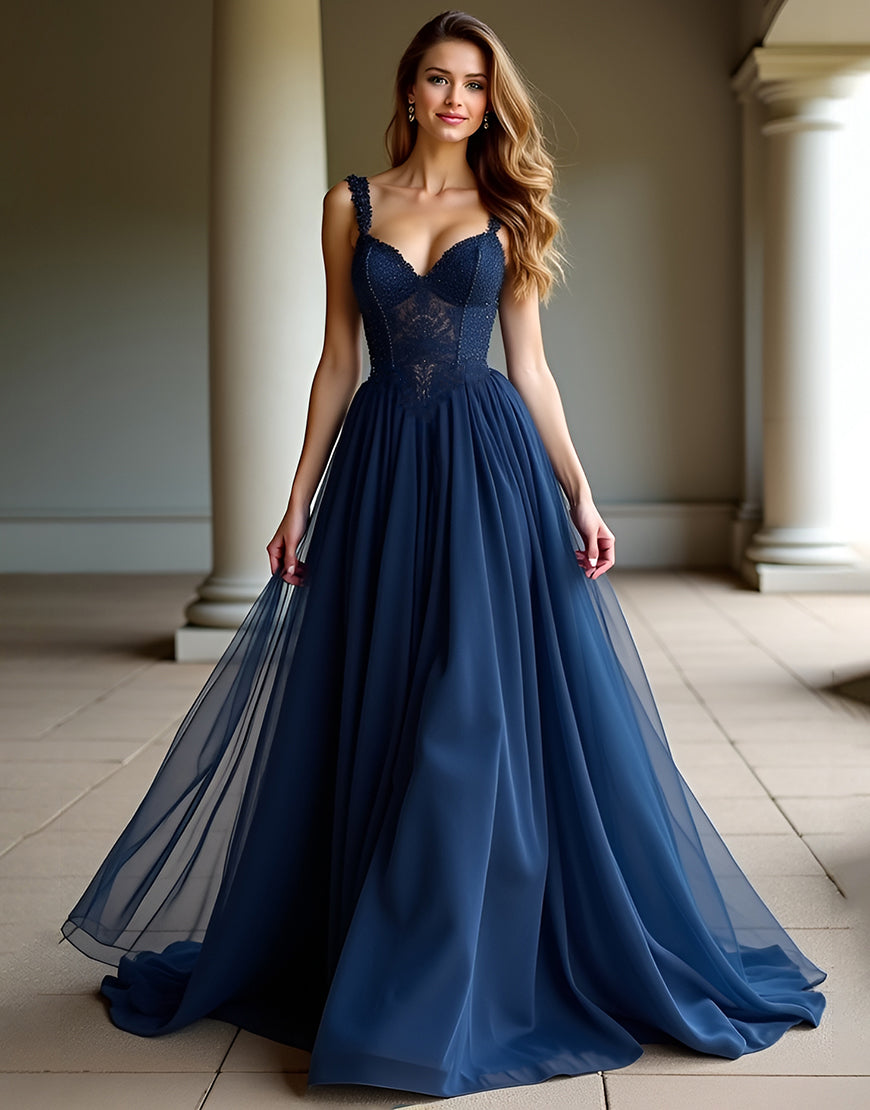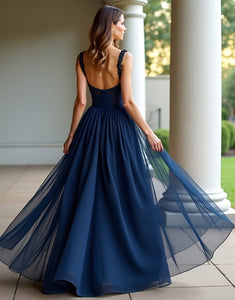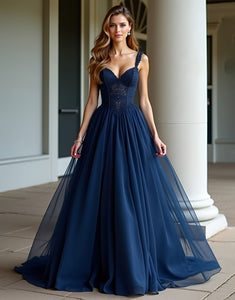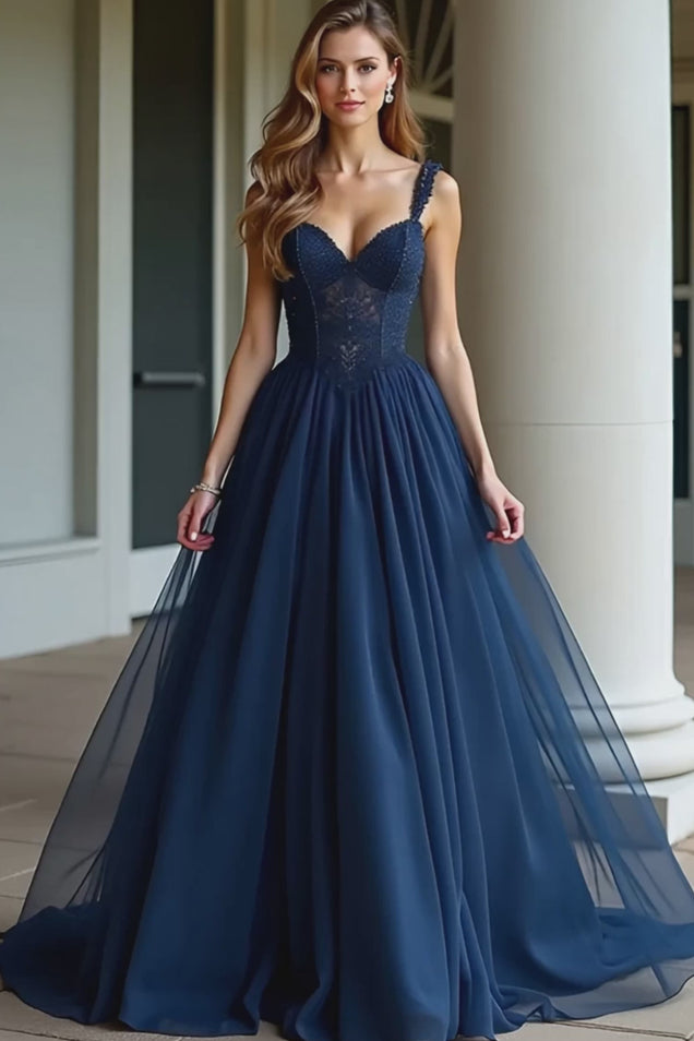 Design: This exquisite A-Line Navy Prom Dress features a flattering sweetheart neckline and delicate spaghetti straps. The sleeveless design and backless style add a touch of elegance, while the lace applique and tulle material create a romantic look. With a sweep train, this dress is perfect for any formal occasion.