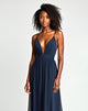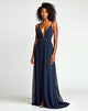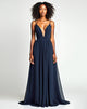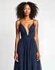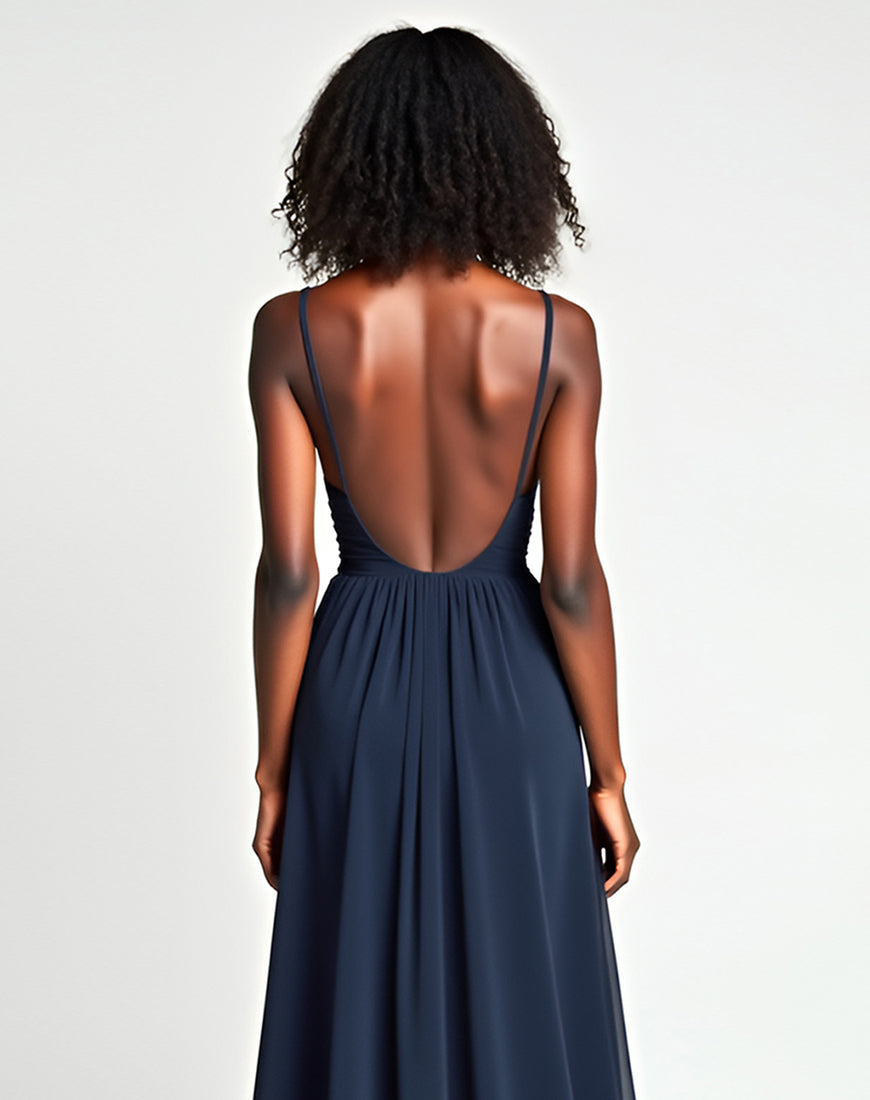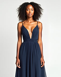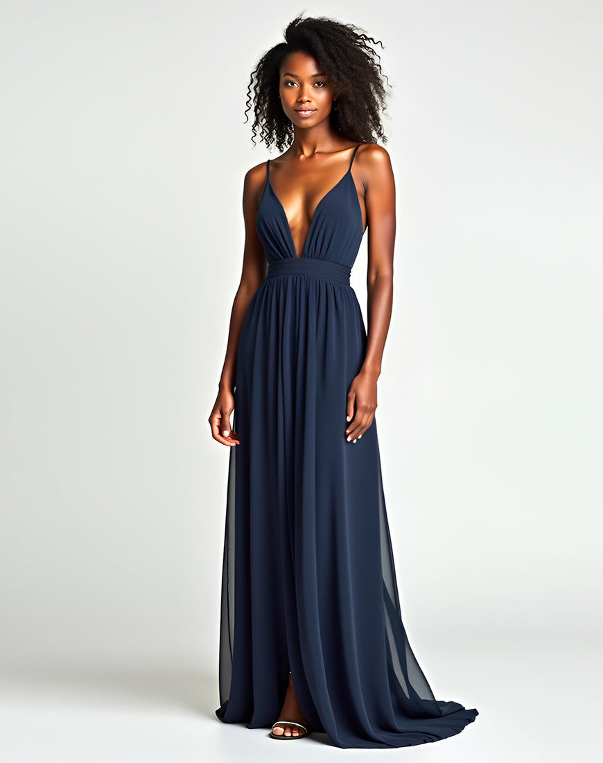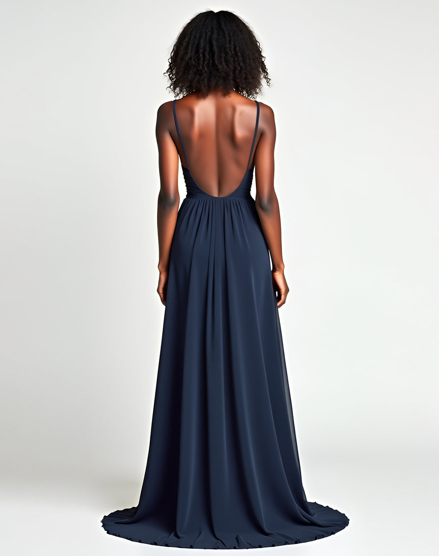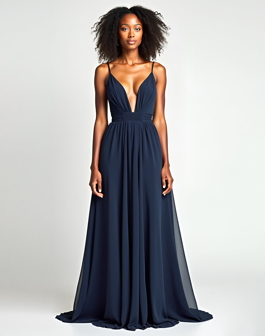A-Line Spaghetti V-Neck Pleated Navy Sweep Train Formal Dress