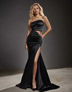 Black Mermaid Strapless Bateau Neck Slit Sweep Train Formal Dress