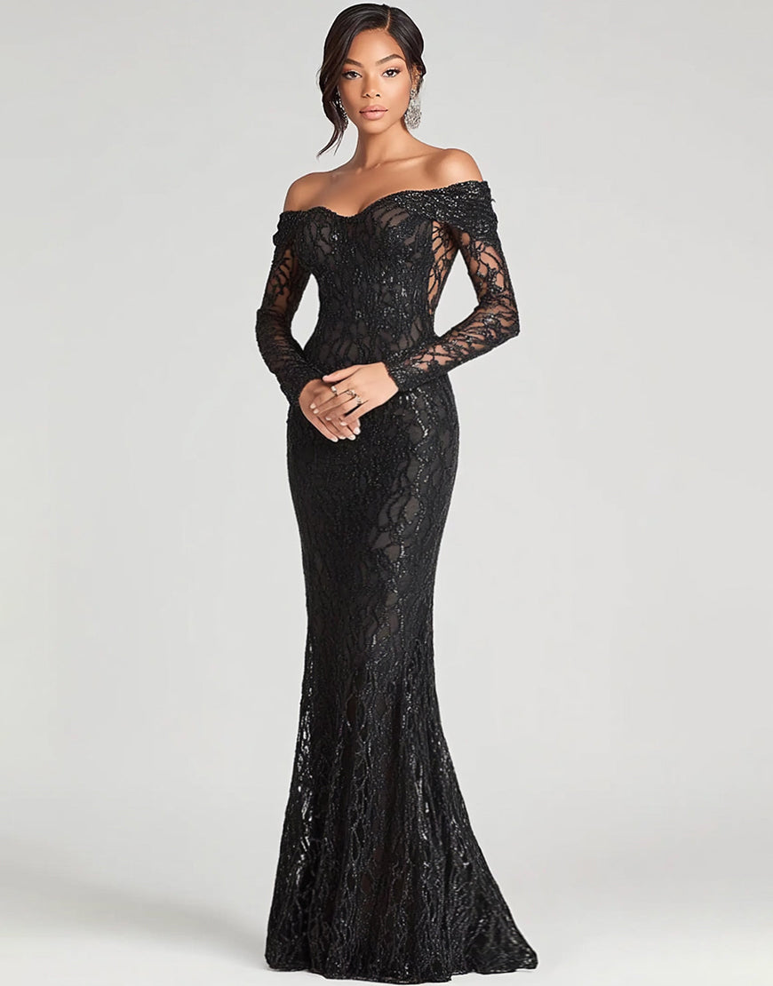 Black Sheath Off The Shoulder Mesh And Lace Formal Dress