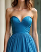 Design: This blue A-line prom dress boasts a sweetheart neckline, cascading ruffles, and a floor-length hemline. The strapless and backless design adds a touch of elegance and sophistication. You'll feel like a princess in this dress, perfect for any upcoming formal event.