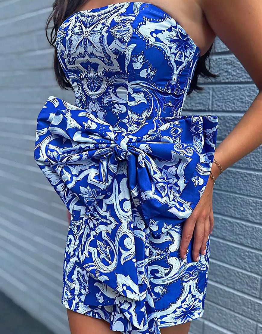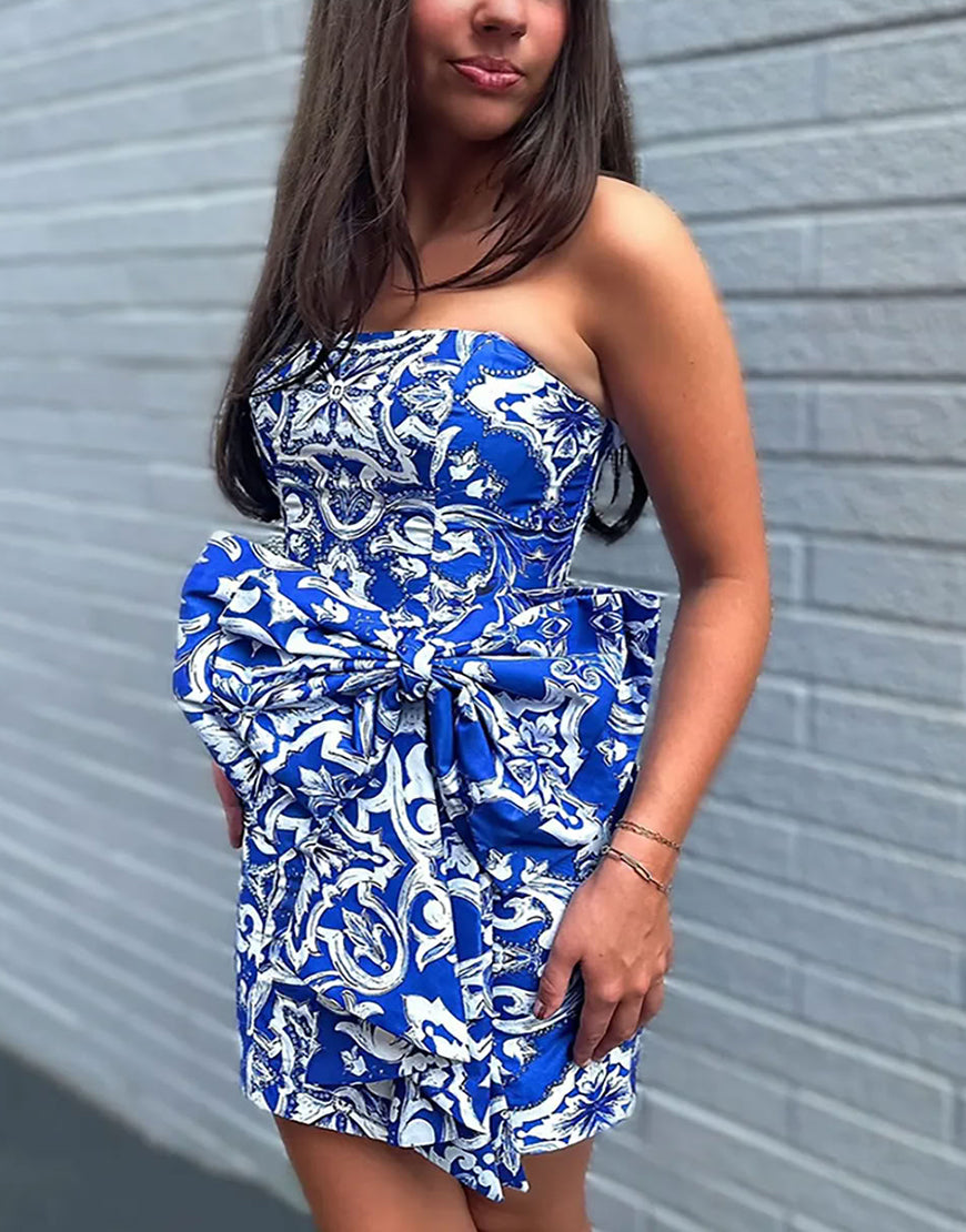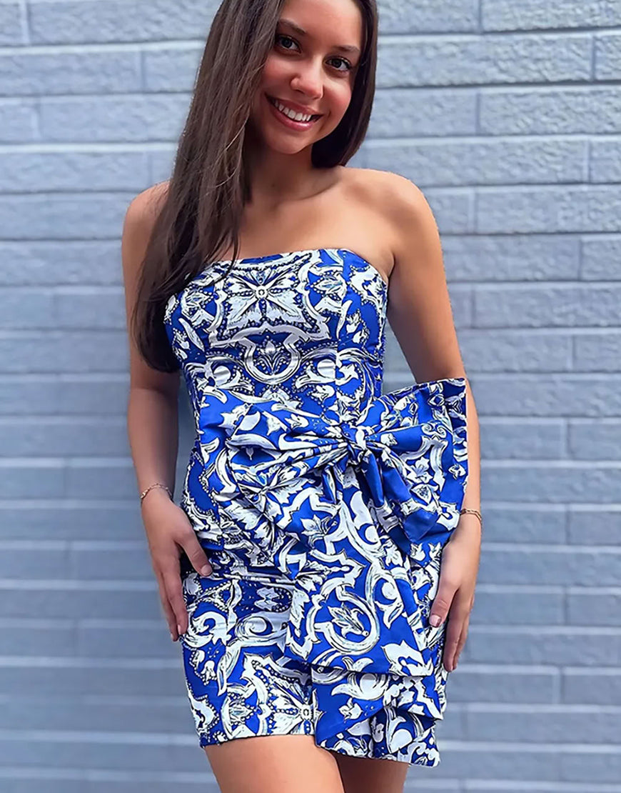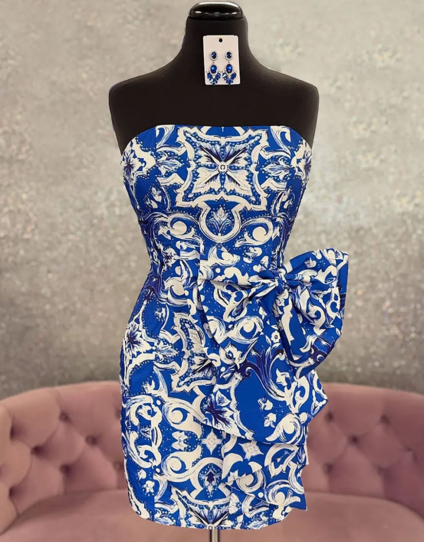 Blue Floral Strapless Tight Homecoming Dress with Bow