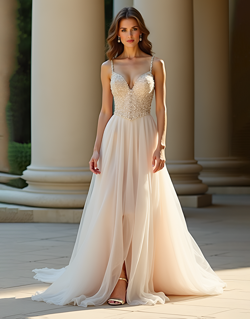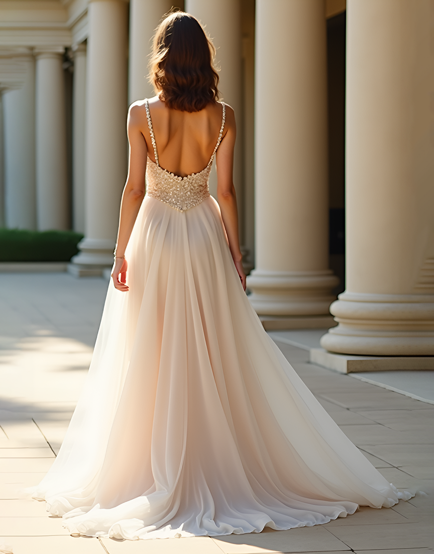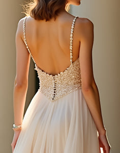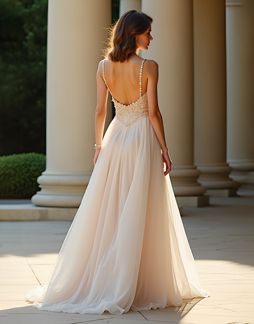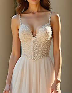 Design: Expertly designed for a stunning and unforgettable prom night, this Champagne Spaghetti Straps A-Line dress features a flattering sweetheart neckline and delicate spaghetti straps. The sleeveless and backless design adds a modern touch, while the flowing A-Line silhouette and sweep train create a glamorous and effortless look. Perfect for showing off your figure and dancing the night away.