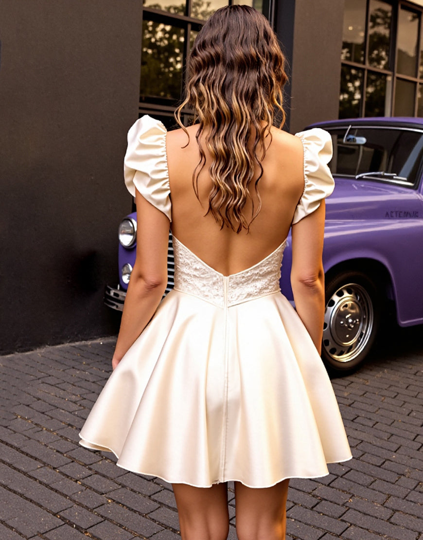 Corset A Line Backless Ivory Homecoming Dress with Puff Sleeves