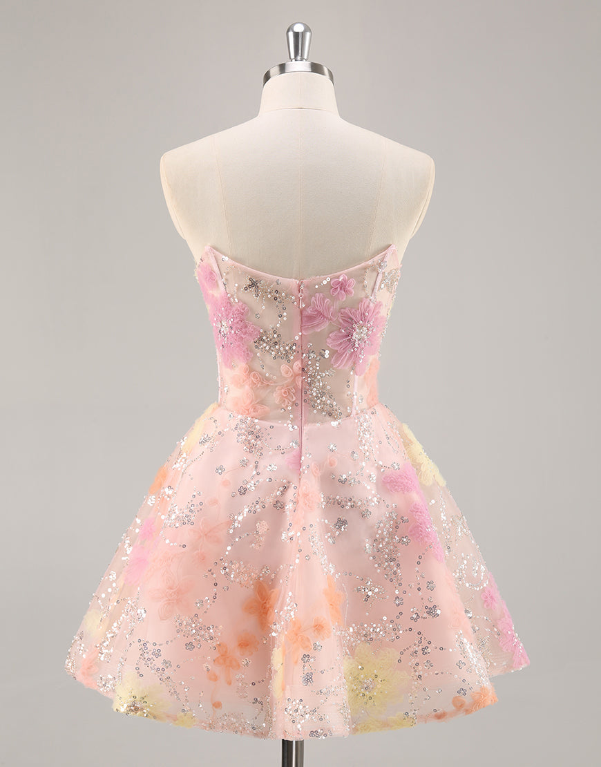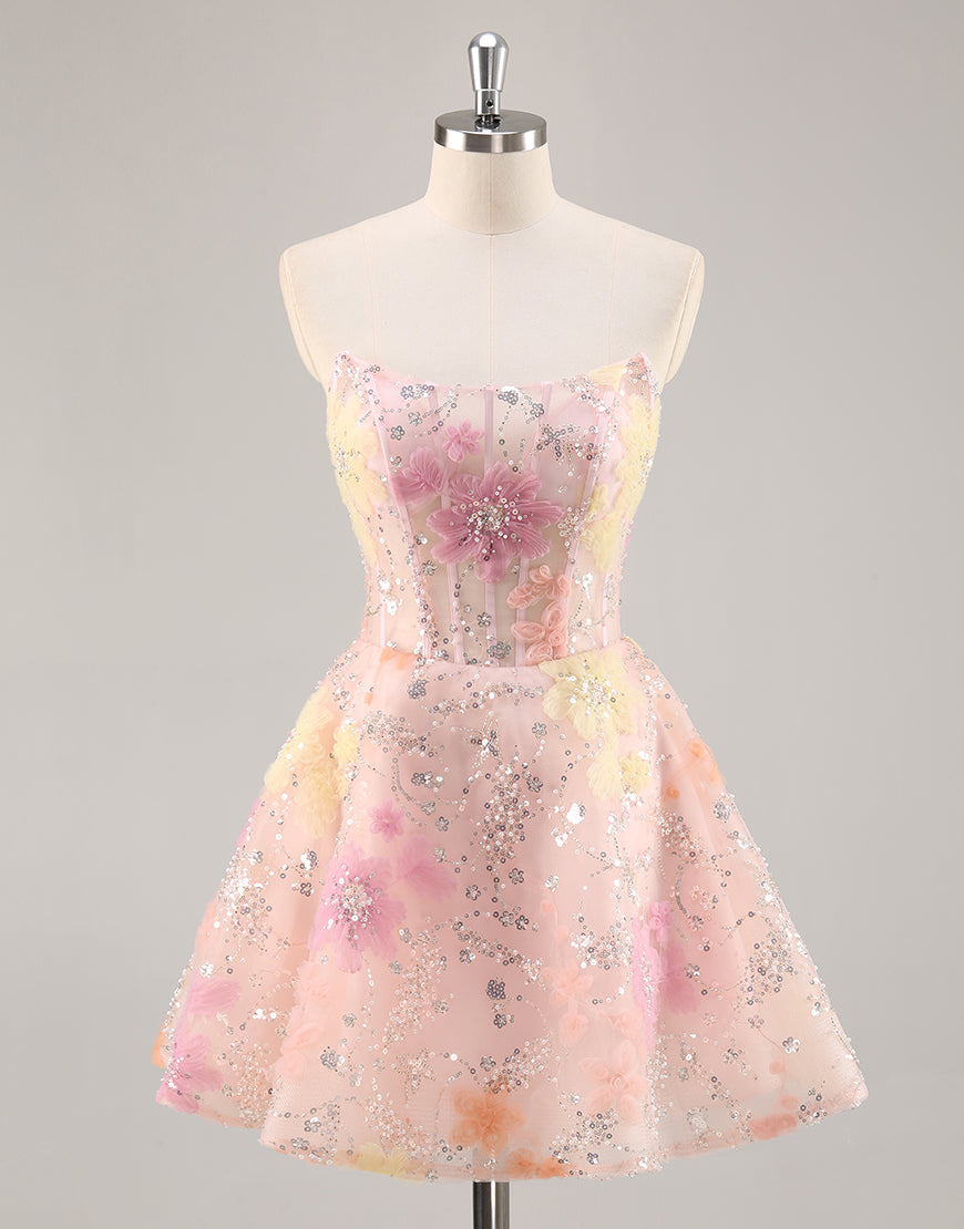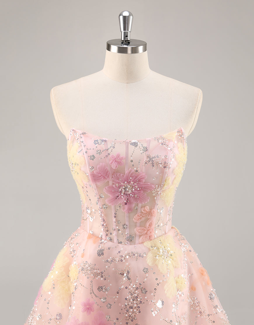 Floral Strapless Appliqued Pink Homecoming Dress with Sequins