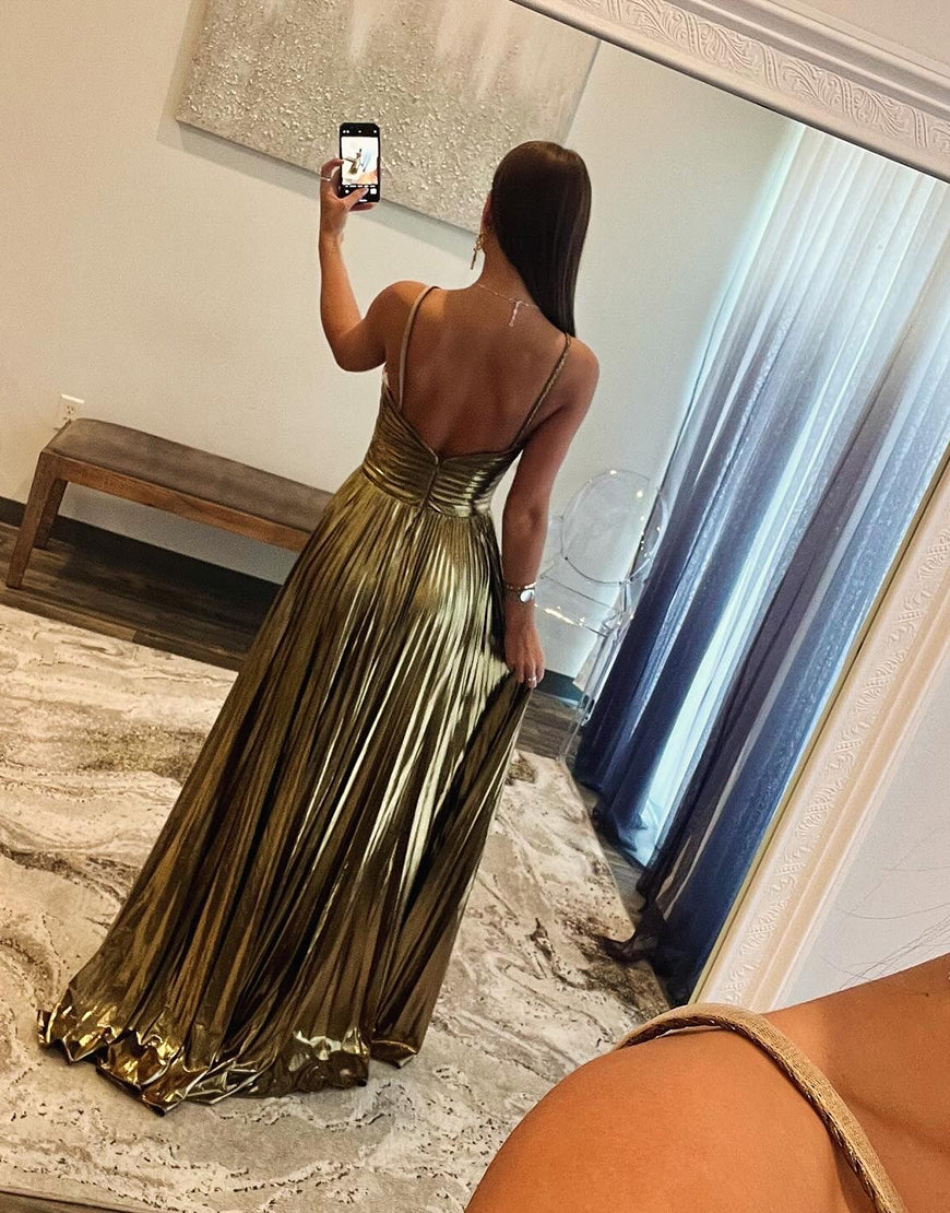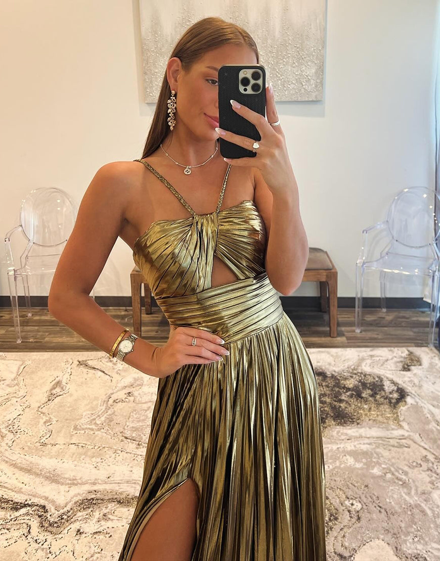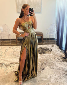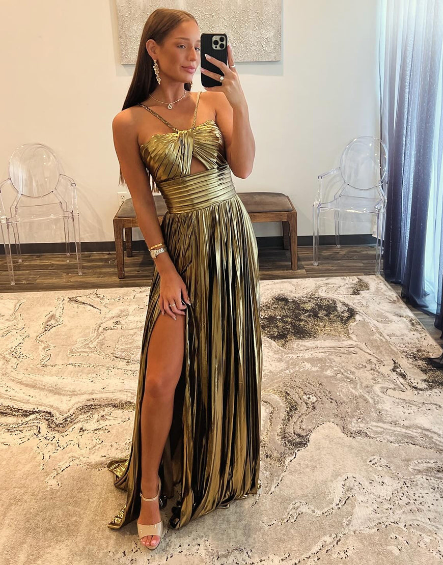 Design: Expertly designed with a gold A-line silhouette, this prom dress is perfect for making a statement. The spaghetti straps, ruched detailing, and slit add a touch of elegance, while the included accessories set completes the look. Make a lasting impression at your prom with this stunning dress.