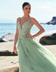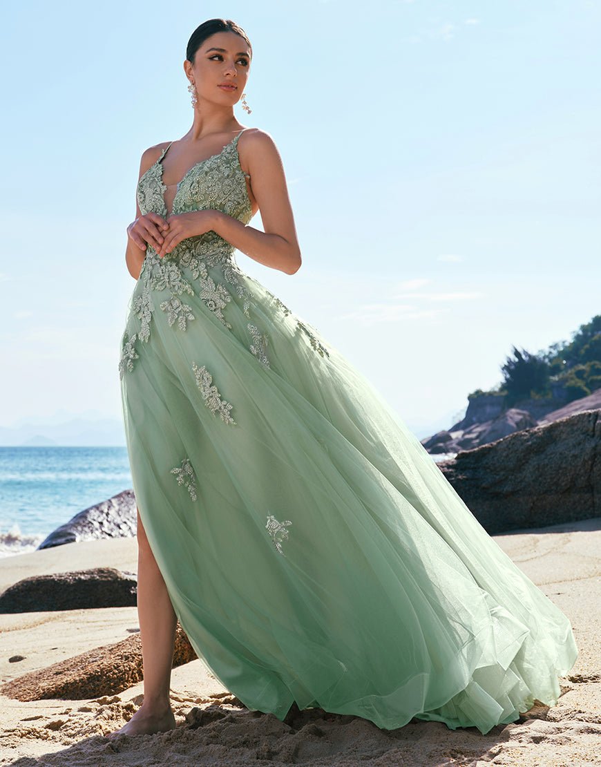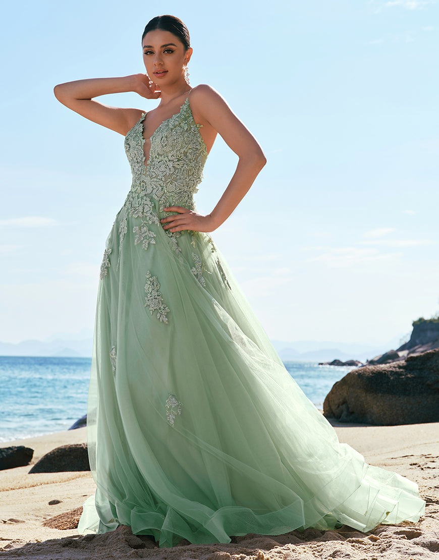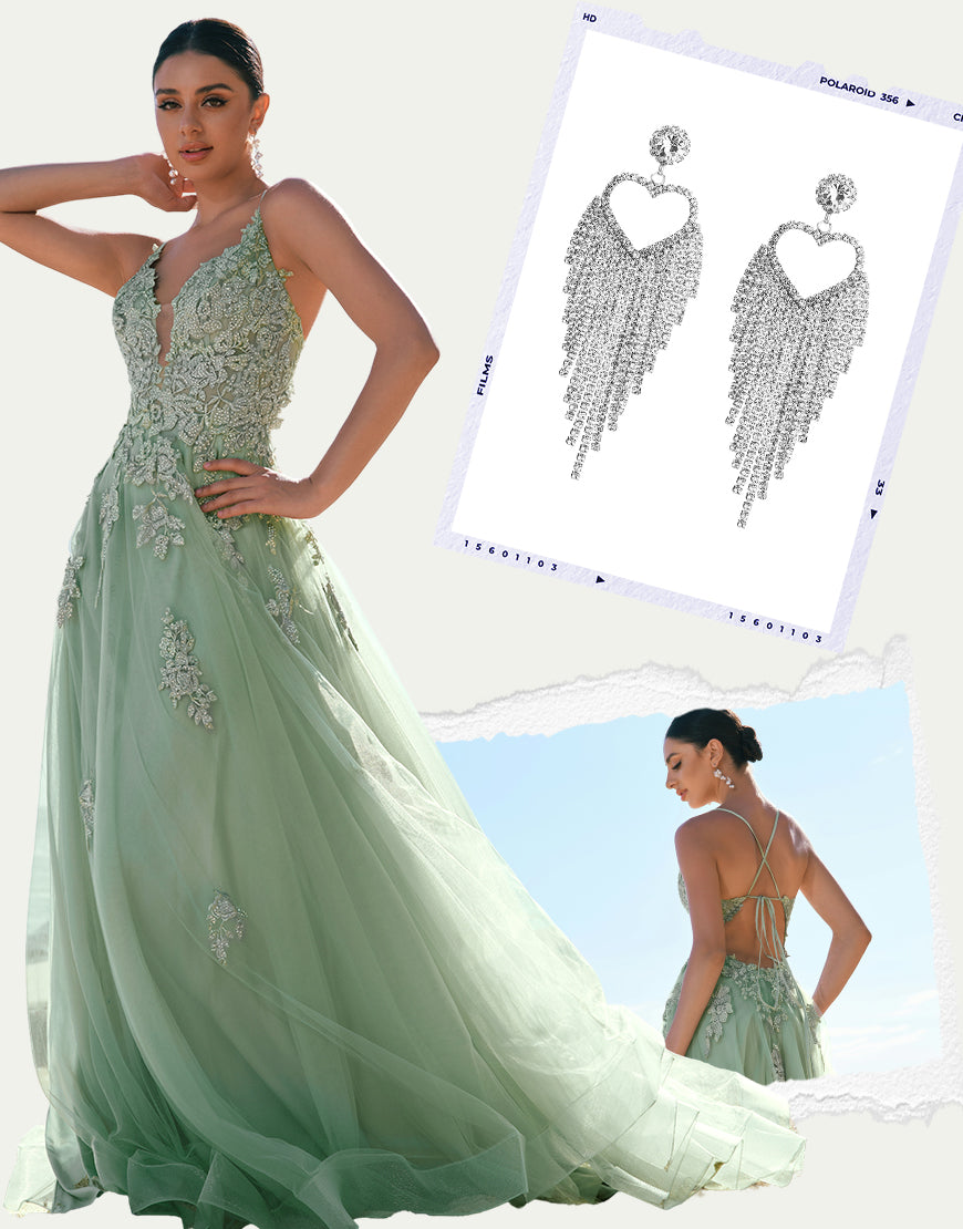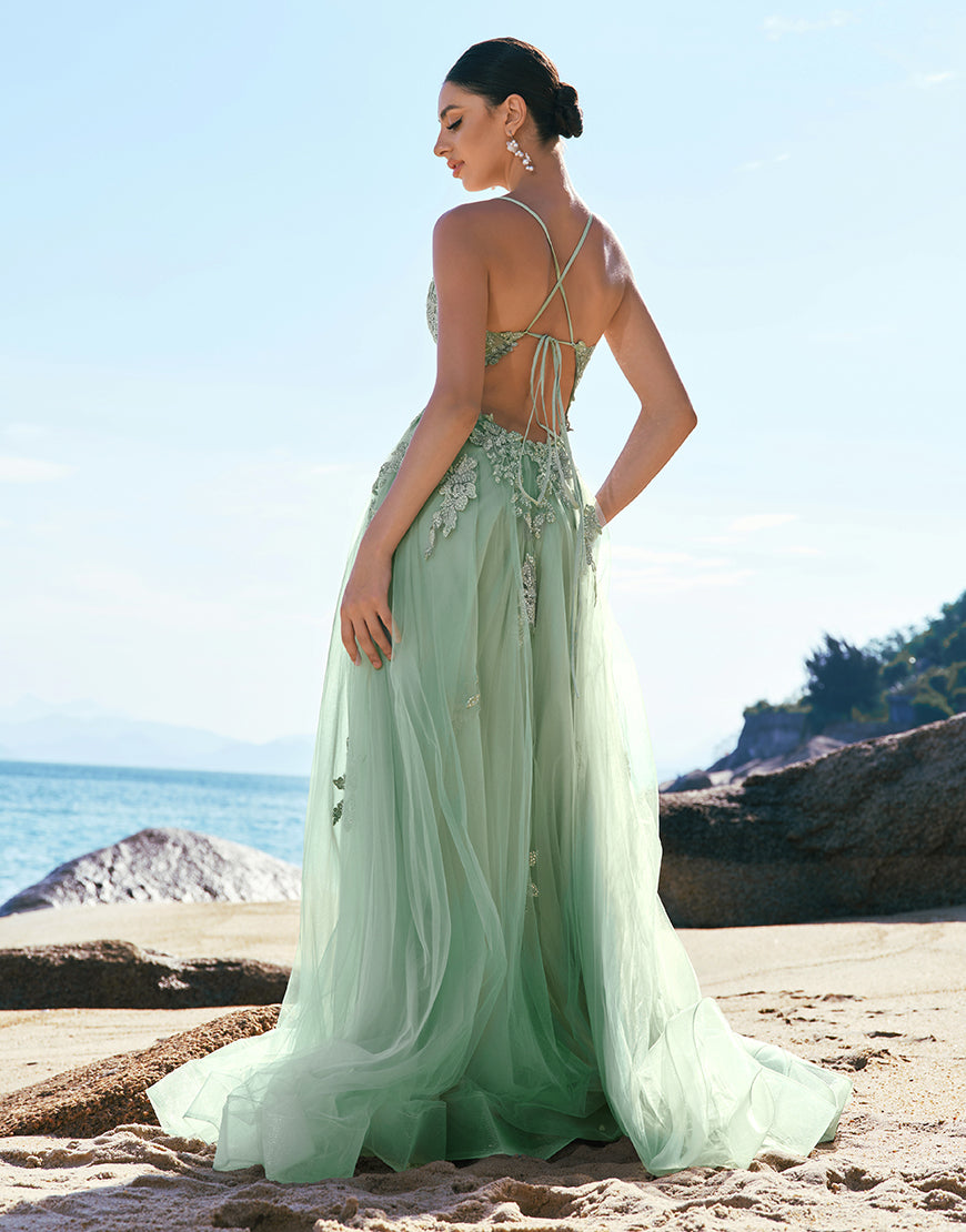 Design: Experience elegance and glamour in our Green Lace Applique A-Line Prom Dress. The delicate lace applique and A-line silhouette will accentuate your figure, while the spaghetti straps and backless design add a touch of allure. Complete the look with our included accessories set for a show-stopping entrance.