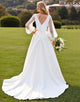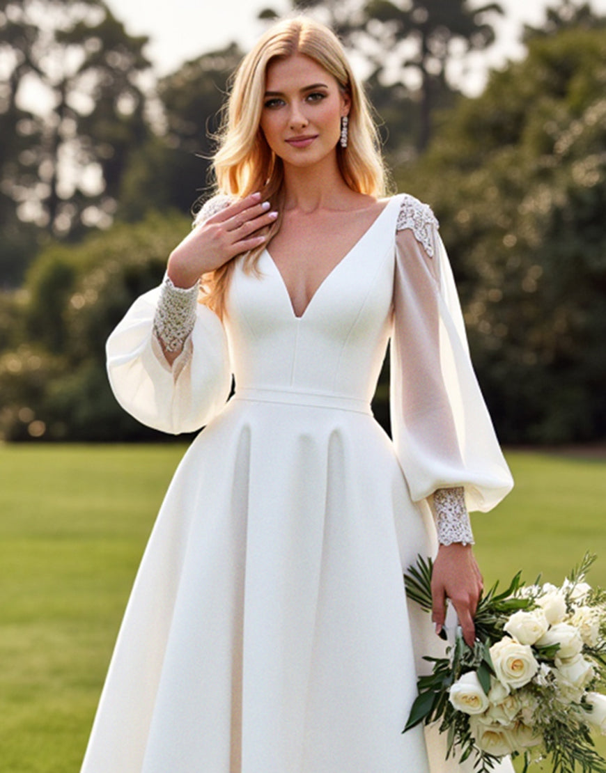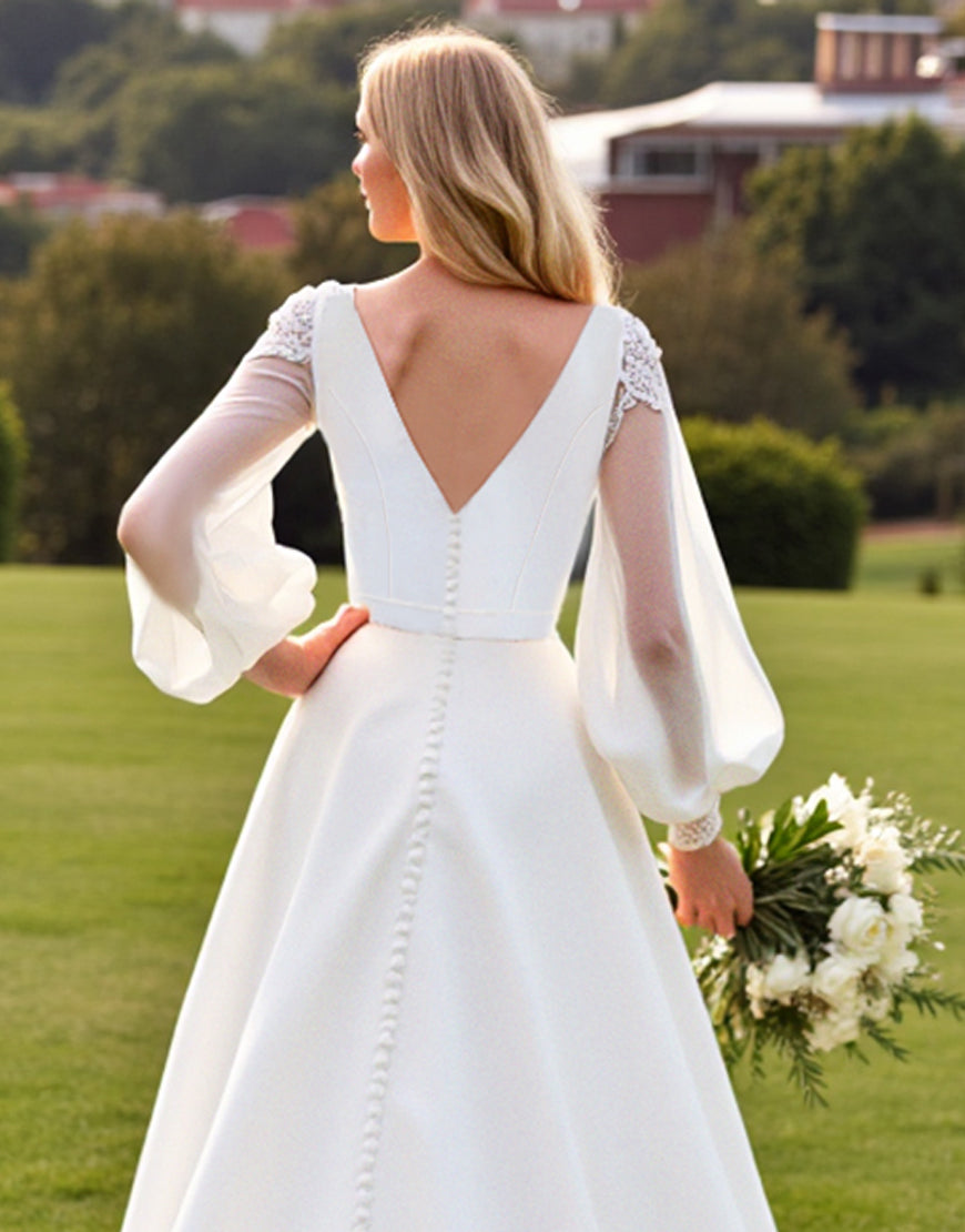 Ivory V-Neck A Line Wedding Dress with Long Sleeves