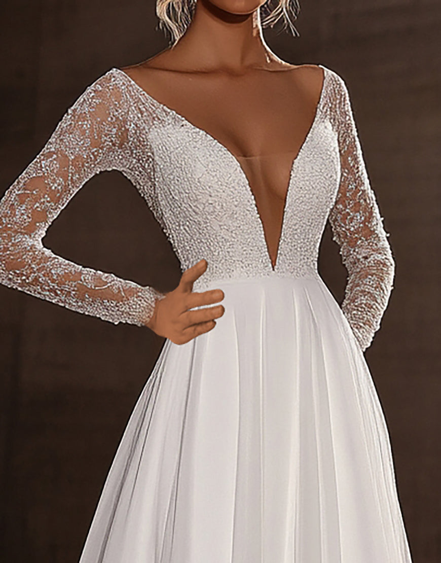 Ivory V Neck Lace Long Sleeve Tulle A Line Wedding Dress with Train