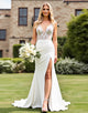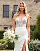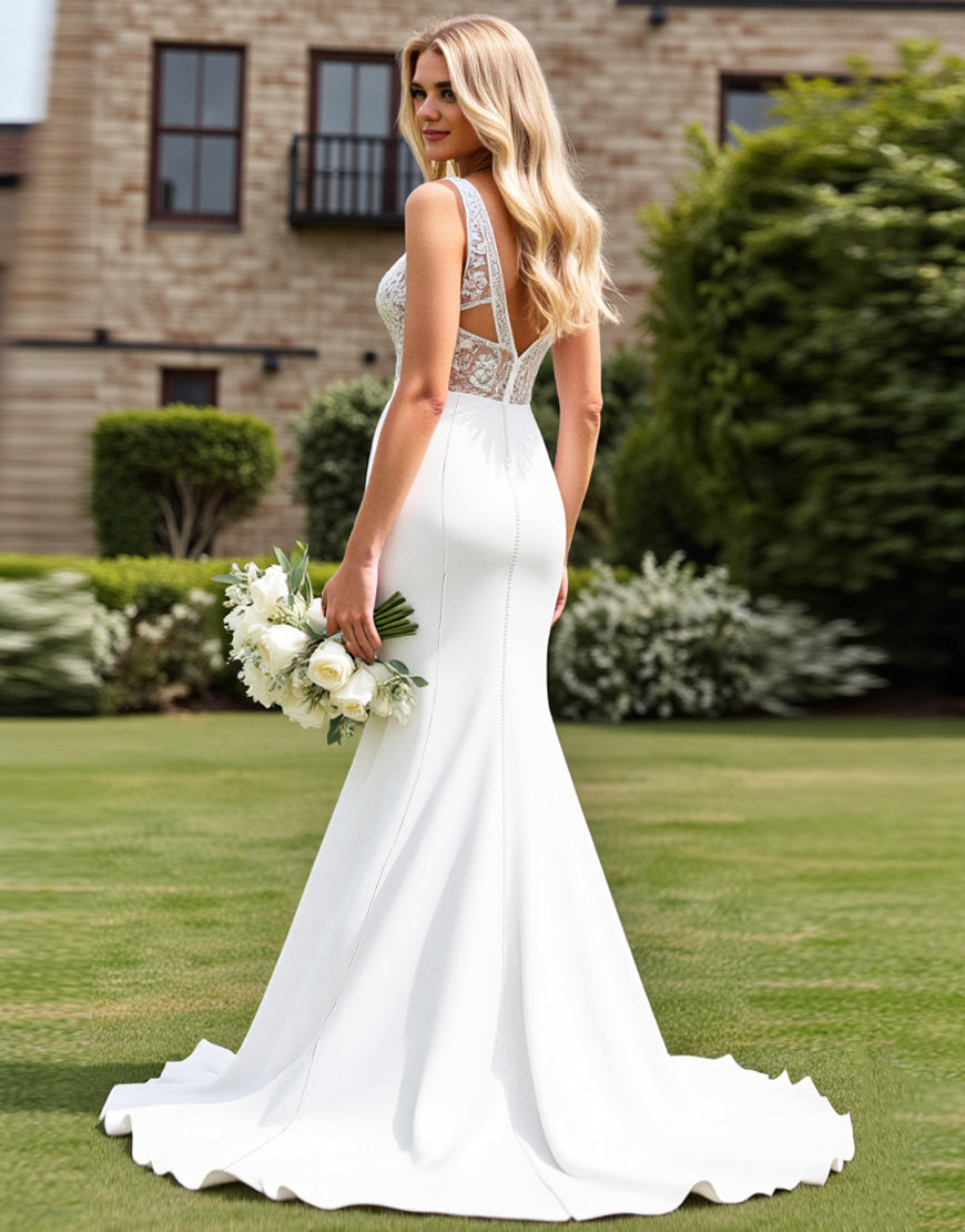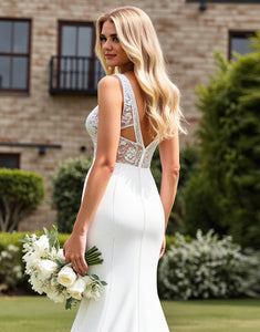 Lace Ivory V Neck Ruched Mermaid Wedding Dress with Slit