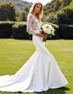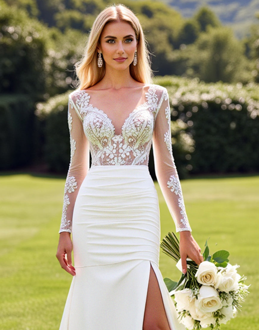 Lace Mermaid Ivory Long Sleeve Wedding Dress with Slit