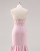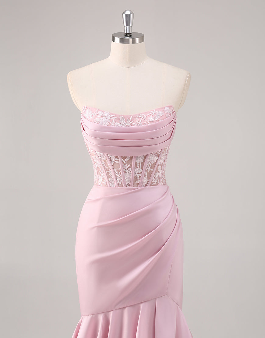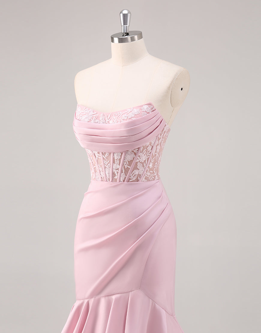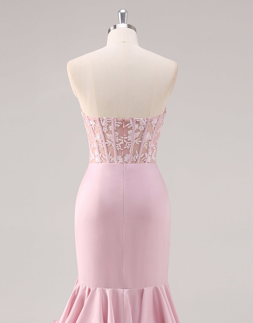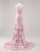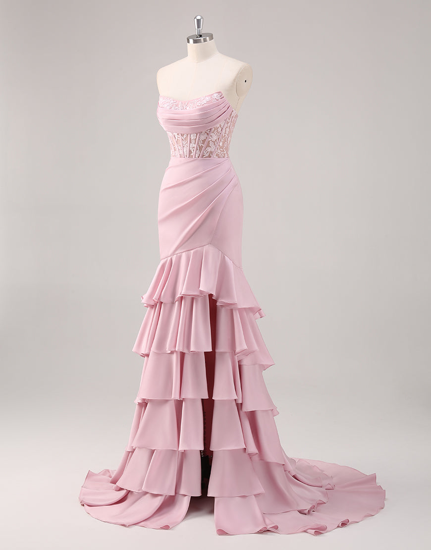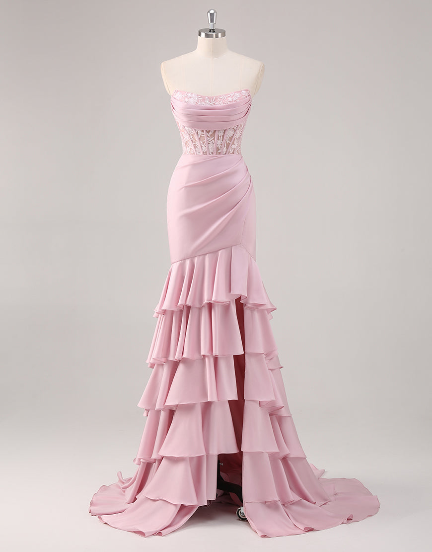 Design: Elevate your elegance in our Mermaid Blush Prom Dress. Featuring a stunning strapless bateau neckline and cascading ruffles, this dress exudes sophistication. The mermaid silhouette and sweep train add a touch of glamour, while the ruched slit and tulle applique chiffon fabric provide a flattering fit. Perfect for prom or any special occasion.