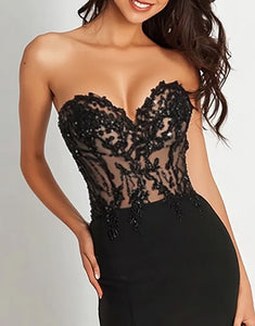 Mermaid Strapless Black Chiffon Prom Dress with Appliques