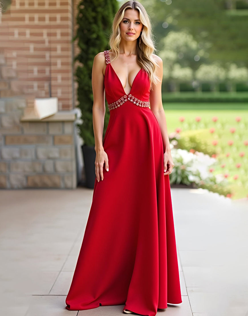 Design: This stunning Rhinestone Spaghetti A-Line Dress features a deep V-neck and sleek spaghetti straps. The sleeveless design and backless detail add a touch of elegance, making it the perfect choice for formal occasions. Its A-line silhouette and sweep train create a flattering look that will make you stand out. Crafted with high-quality rhinestones, this dress is sure to make you shine.