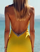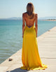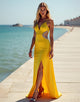 Design: This yellow formal dress features a spaghetti strap V-neck design, with a sleek and elegant sheath silhouette. The backless and sleeveless style is accentuated by a hollow rhinestone slit, adding a touch of glamour to your look. The dress also includes a sweep train for added drama and sophistication. Elevate your formal attire with this stunning and versatile dress.