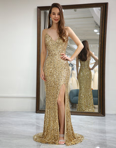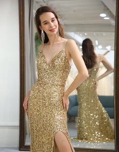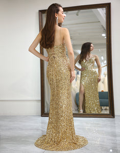 Design: Shine like a mermaid in our Sparkly Mermaid Spaghetti Gold Sequin Slit Prom Dress. With a V-neck and lace-up back, you'll make a statement. The accessories set completes the ensemble.