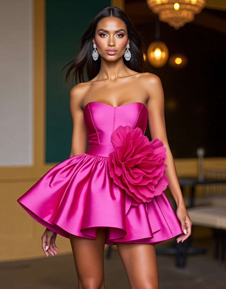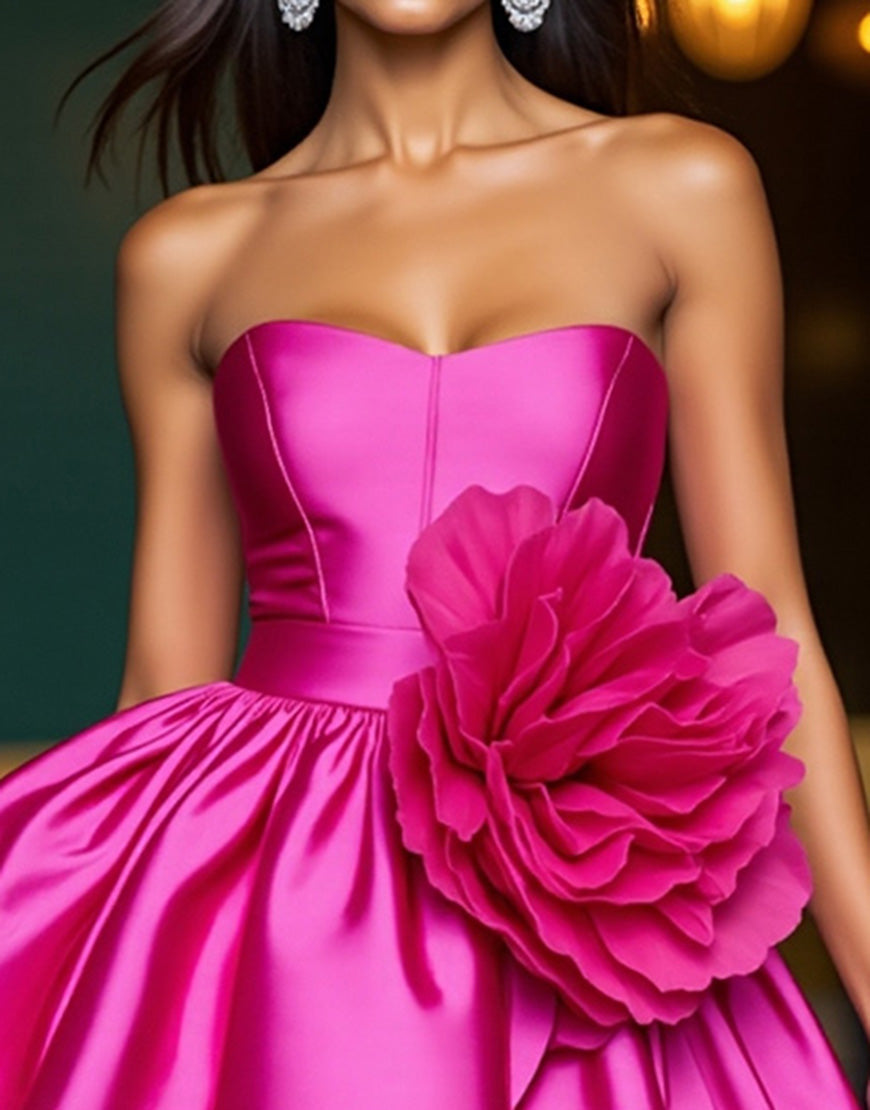 Strapless Fuchsia Satin Homecoming Dress with 3D Flowers