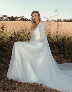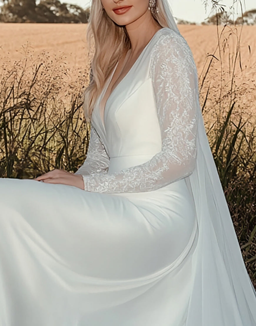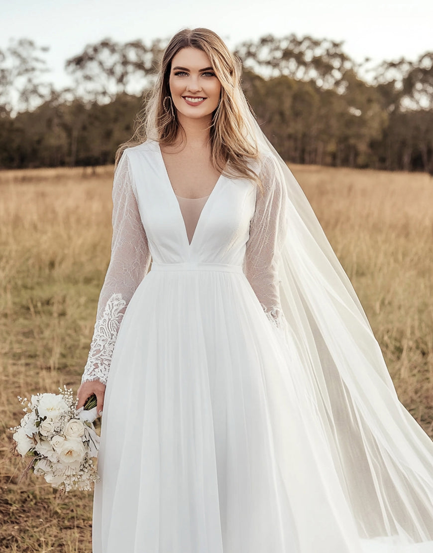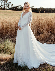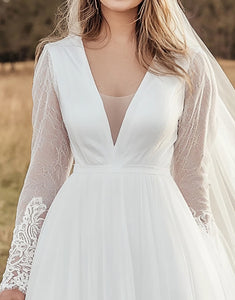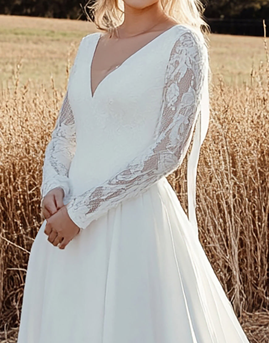 Timeless A Line V Neck Lace Long Sleeve Ivory Wedding Dress