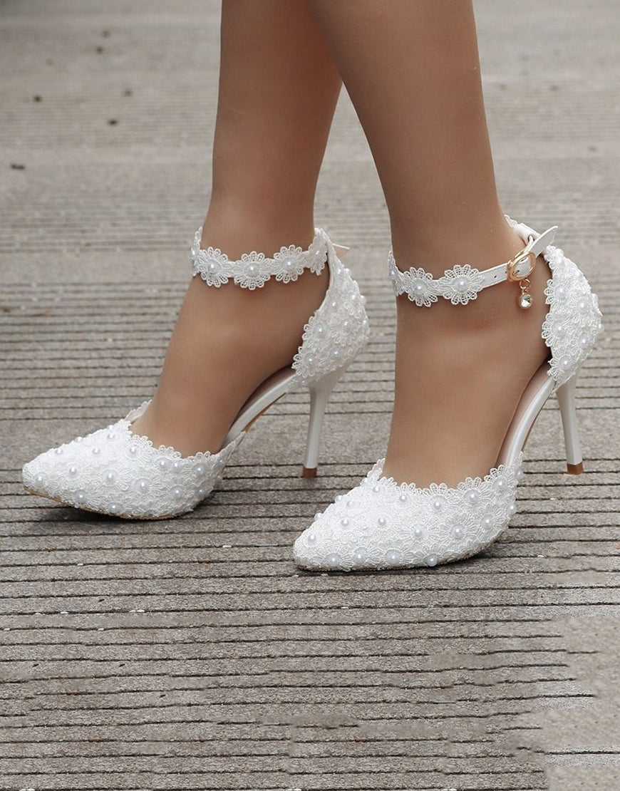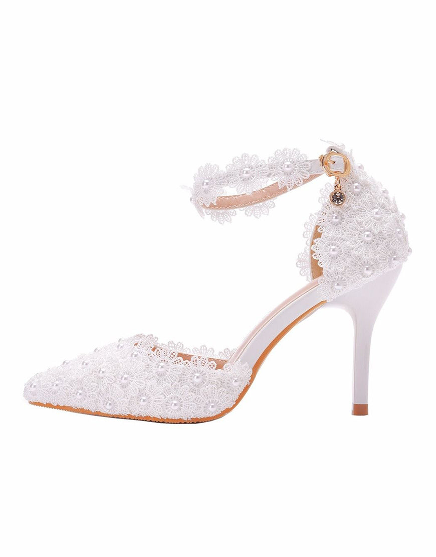 White Single-Ankle-Strap Pointed-Toe Wedding Heels