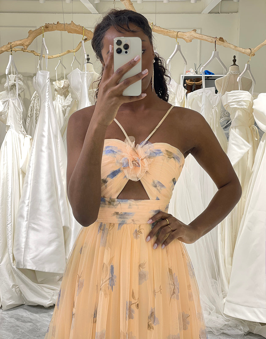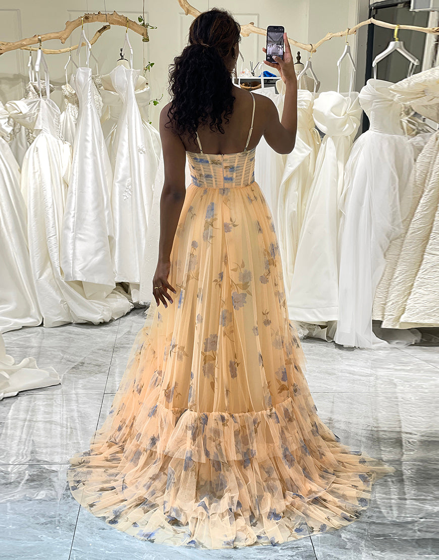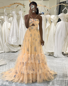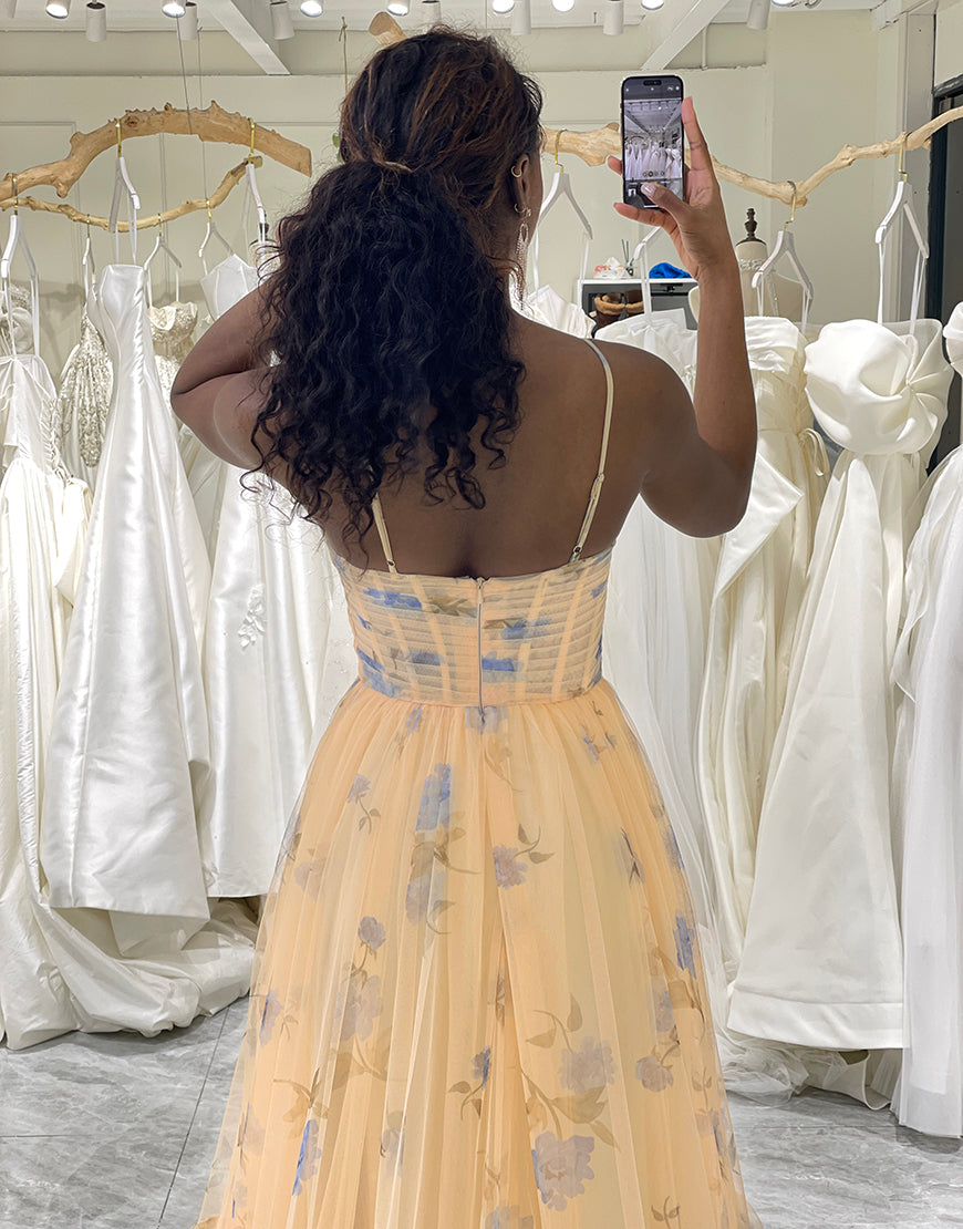 Design: Expertly crafted with a yellow A-line silhouette, spaghetti straps, and a sweeping train, this prom dress will make you stand out from the crowd. The sleeveless and backless design, along with the intricate print on the tulle fabric, adds a touch of elegance and charm. Perfect for a magical night.